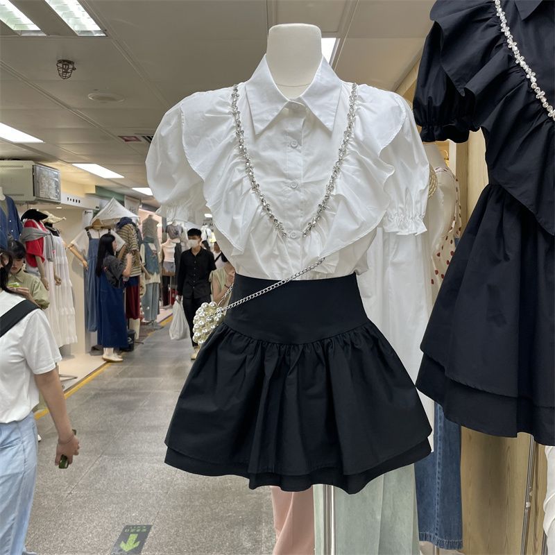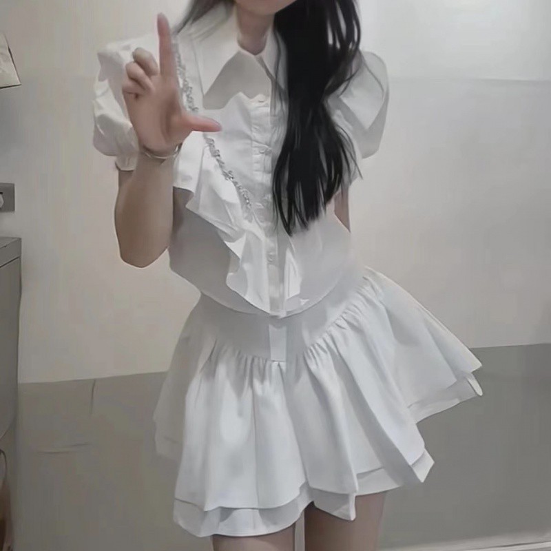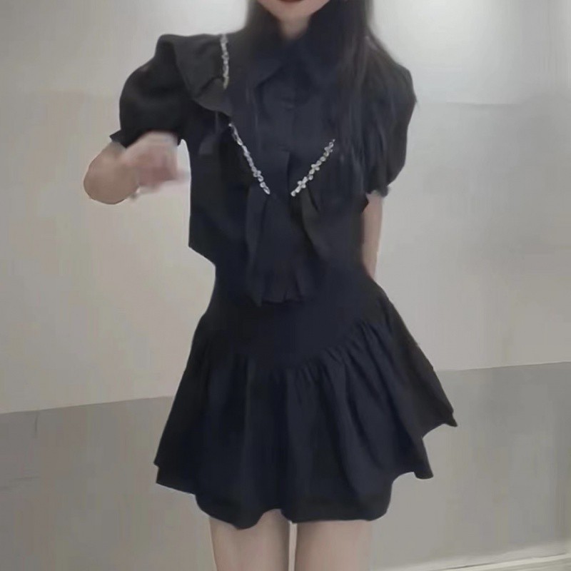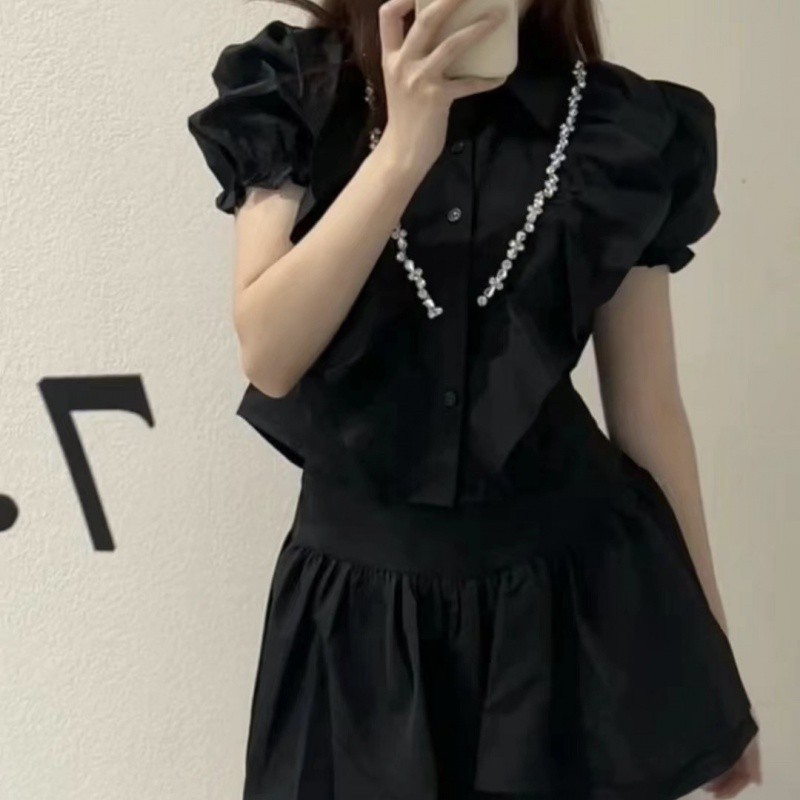 | nameOriginal | 2023 Summer New Arrival Diamond Ruffled Bubble Sleeve Short Shirt Top High Waist Slim Floral Bubble Dress Women's Suit |