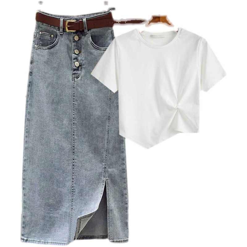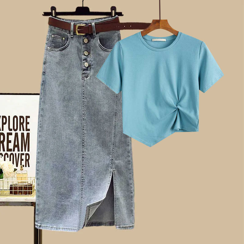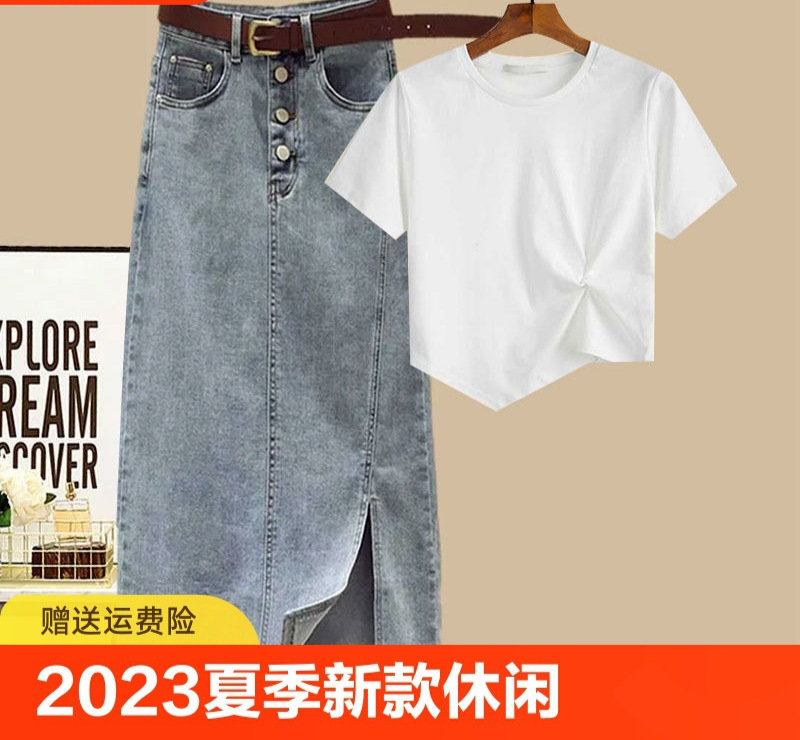 | nameOriginal | 2023 Summer New Casual All-match T-shirt Top Fashion Slimming Split Denim Skirt Two-piece Suit Women |