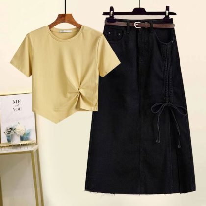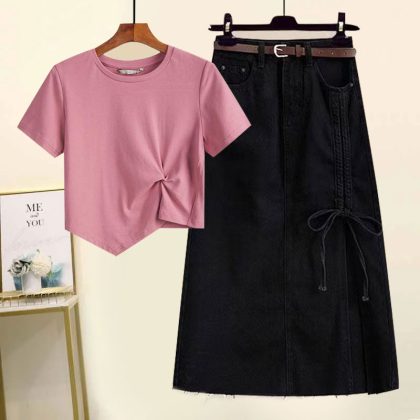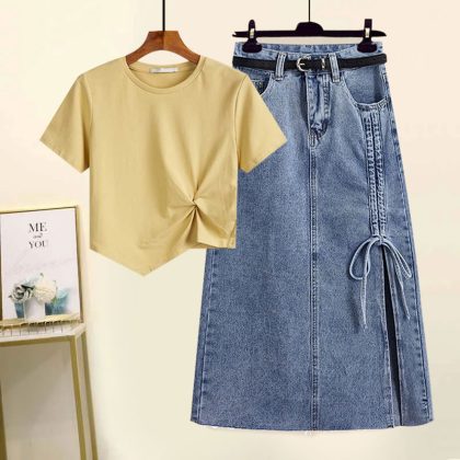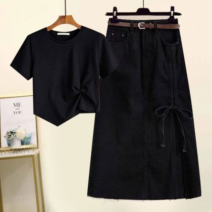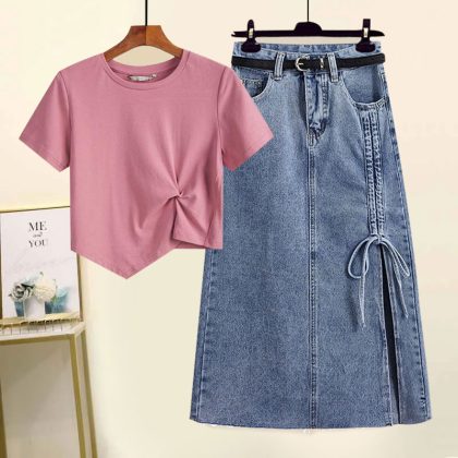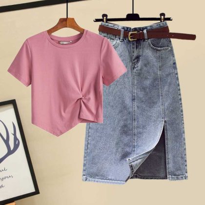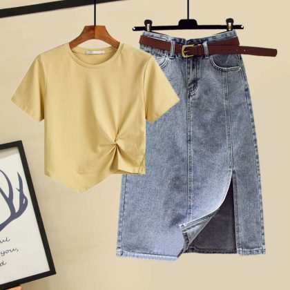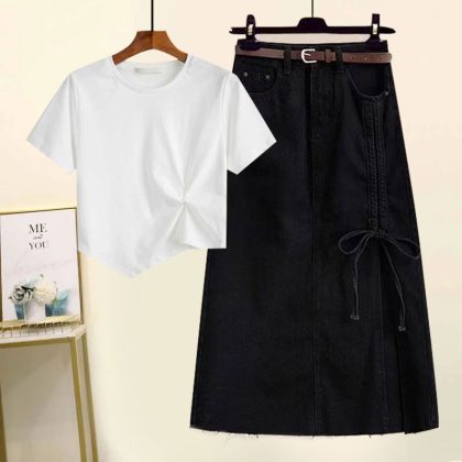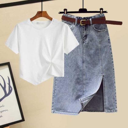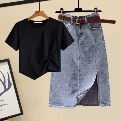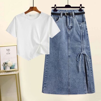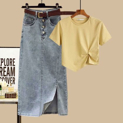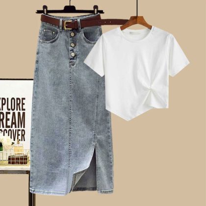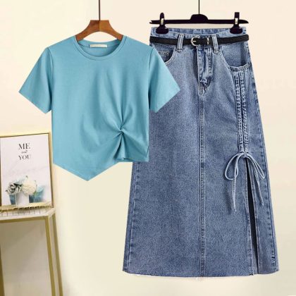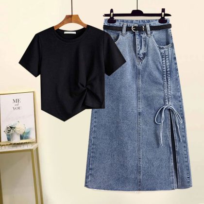 | nameOriginal | 2023 Summer New Casual All-match T-shirt Top Fashion Slimming Split Denim Skirt Two-piece Suit Women |