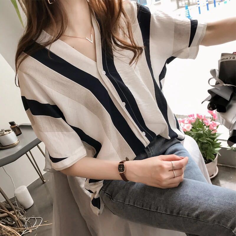 2023 Summer New Fashionable Loose Large Size V-neck Striped Shirt Women’s Short-sleeved Top BF Casual Korean Style