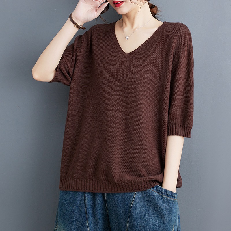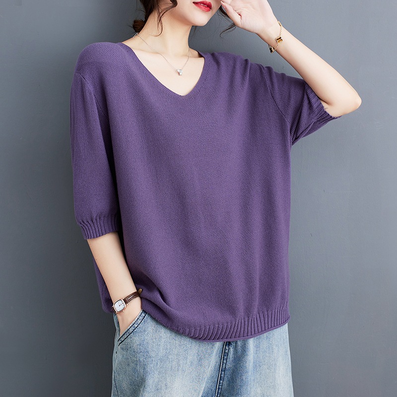 2023 Summer New Fat Girl Lazy Style Curl Casual All-match Solid Color V-neck Large Size Short-sleeved T-shirt Trendy