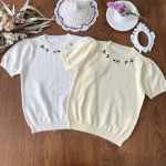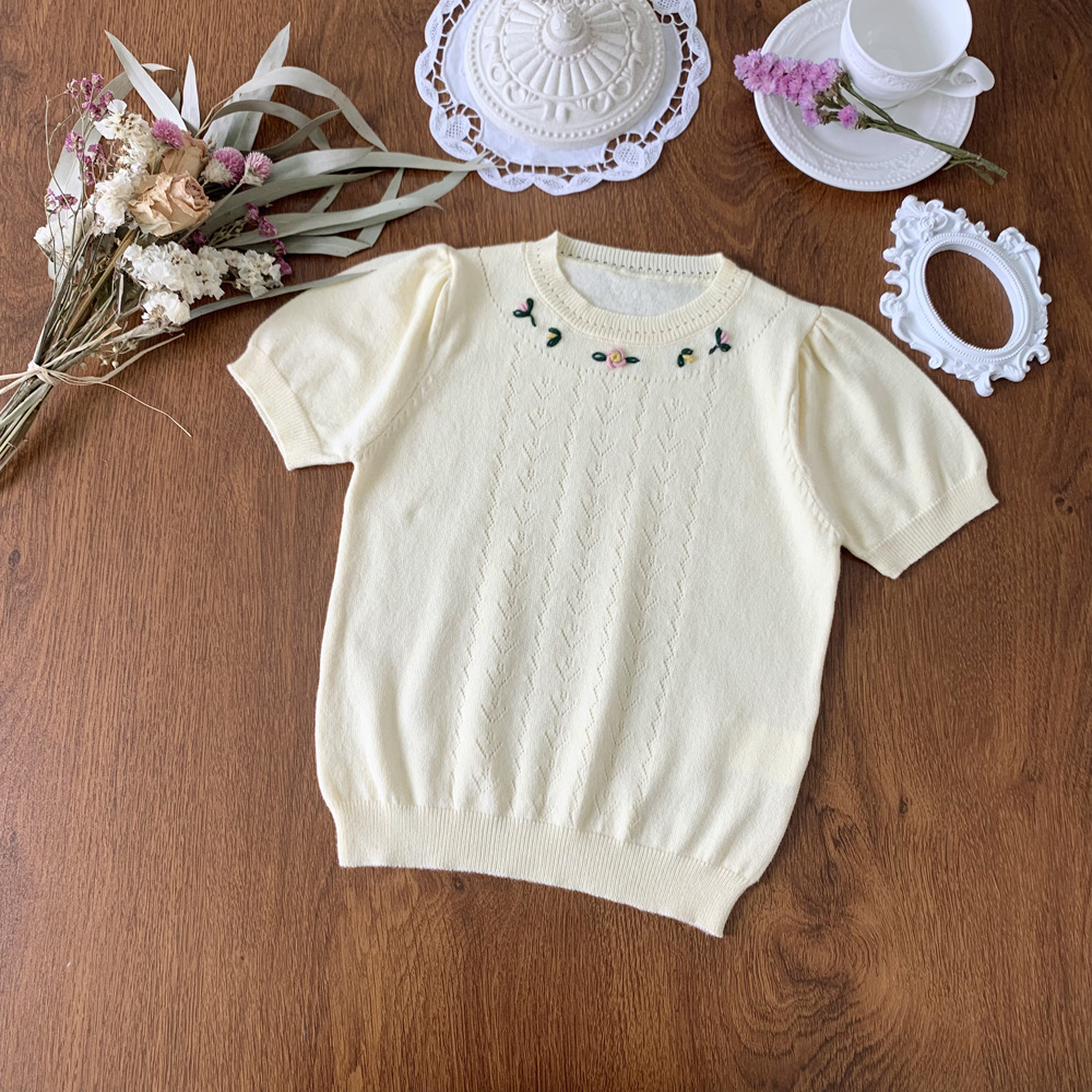2023 Summer New Girls’ Cotton Yarn Short-sleeved Knitted Sweater Hollow Thin Threading Handmade Embroidered Short-sleeved Knitted Sweater