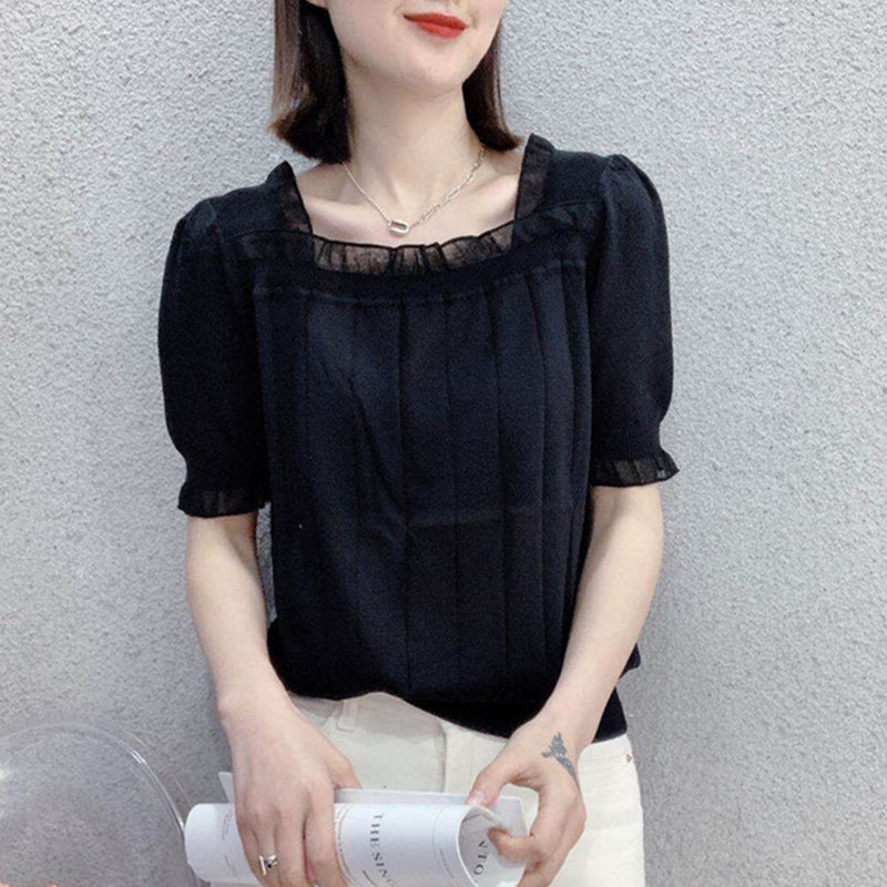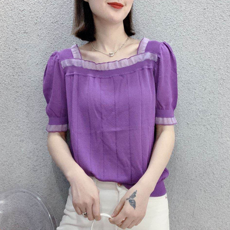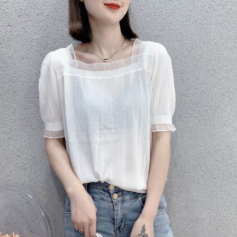 2023 Summer New Korean Style Loose Slimming Internet Celebrity Same Style Lace Stitching Square Neck Short Sleeve Sweater for Women