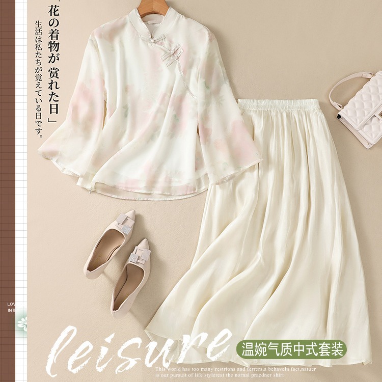 | nameOriginal | 2023 Summer new retro ethnic style improved cheongsam Zen tea clothing printed top + skirt suit women |