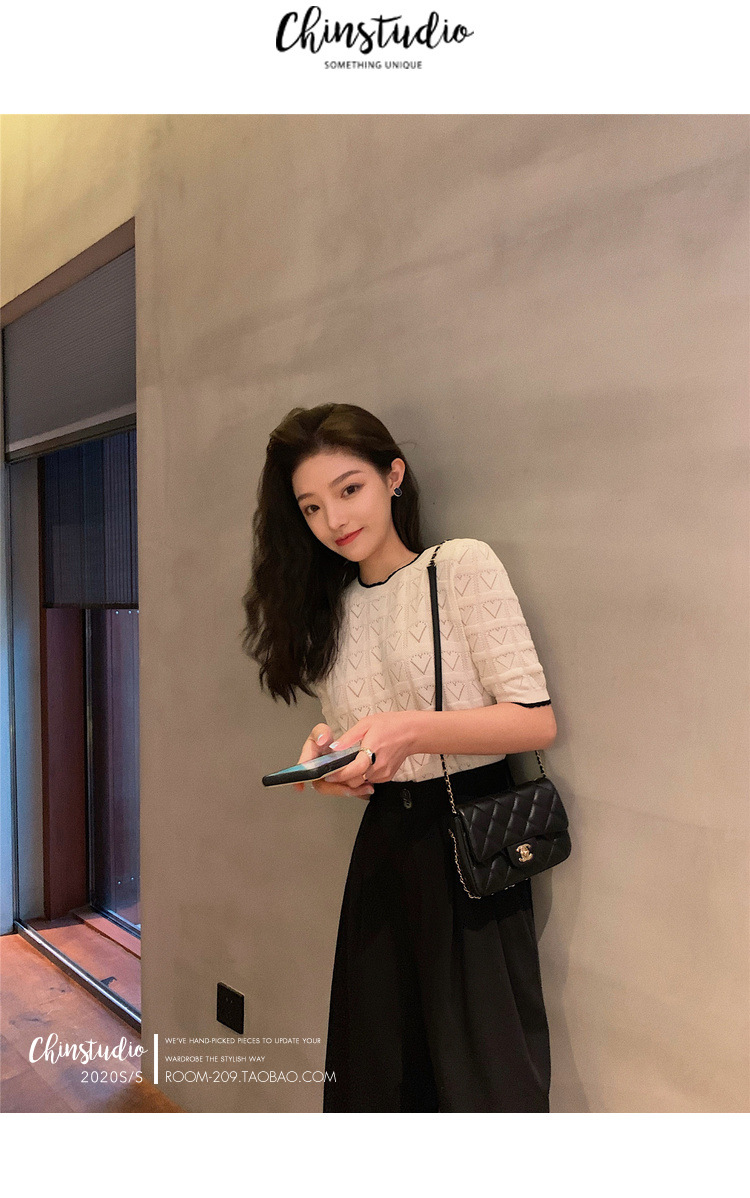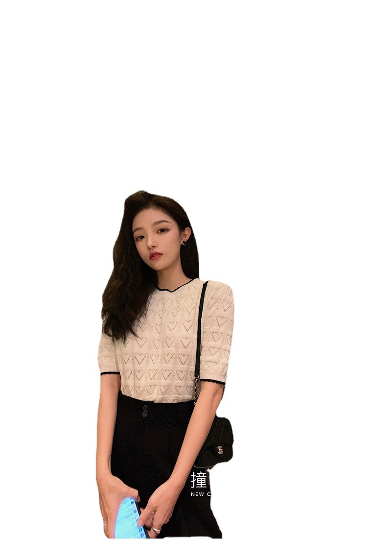 | nameOriginal | 2023 Summer new round neck contrast color lovely knitted top women's hollow loose lazy style short sleeve T-shirt base |