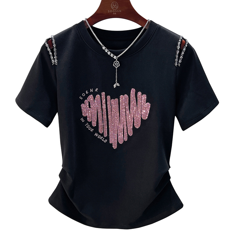 | nameOriginal | 2023 Summer New Short-sleeved T-shirt Women's Stretch Slimming Heavy Industry Nail Beads Open Shoulder Irregular Split Hem Top |