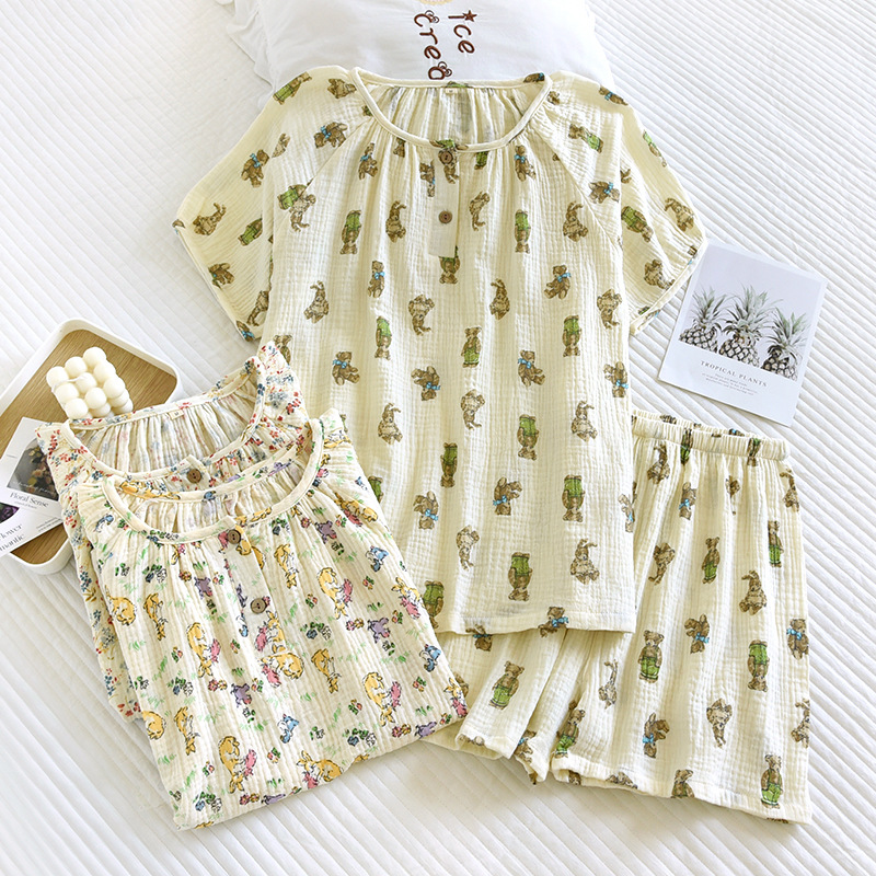 2023 Summer New Style Crepe Short-sleeved Shorts Double-layer Cotton Yarn Women's Home Clothes Summer Fresh Pajamas Set