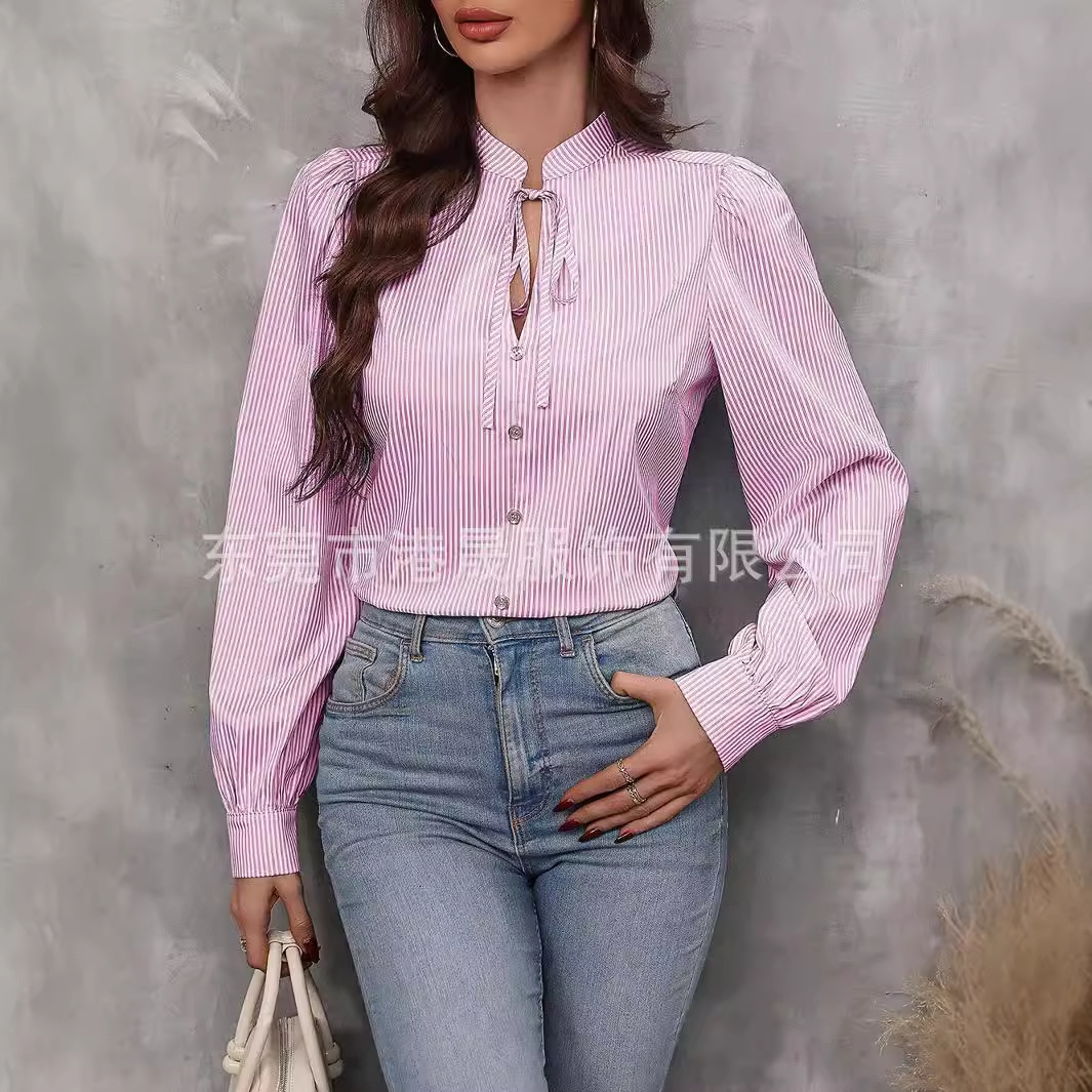 | nameOriginal | 2024 Amazon New Women's Cross-border European and American Half-open Collar Lace-up Pullover Long-sleeved Elegant Commuter Striped Shirt |