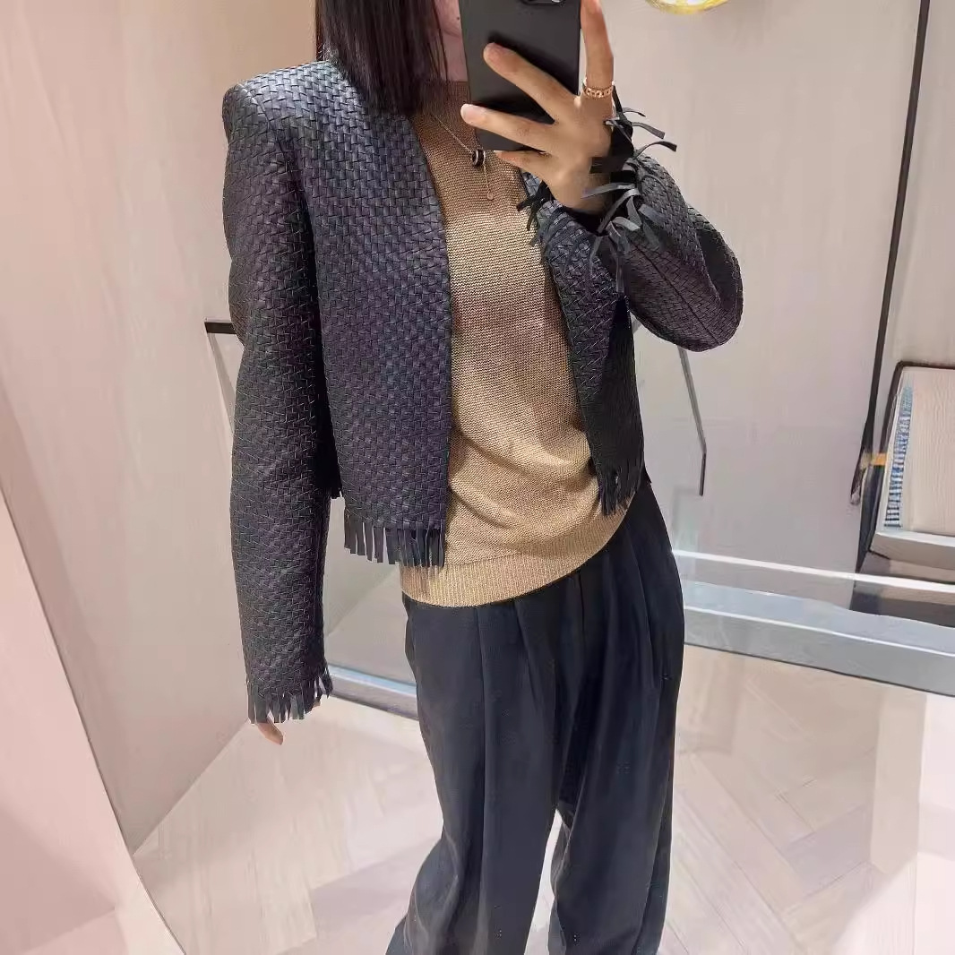 2024 autumn and winter new Andiamo tassel jacket leather hand-woven shoulder pad design three-dimensional shaped sheepskin