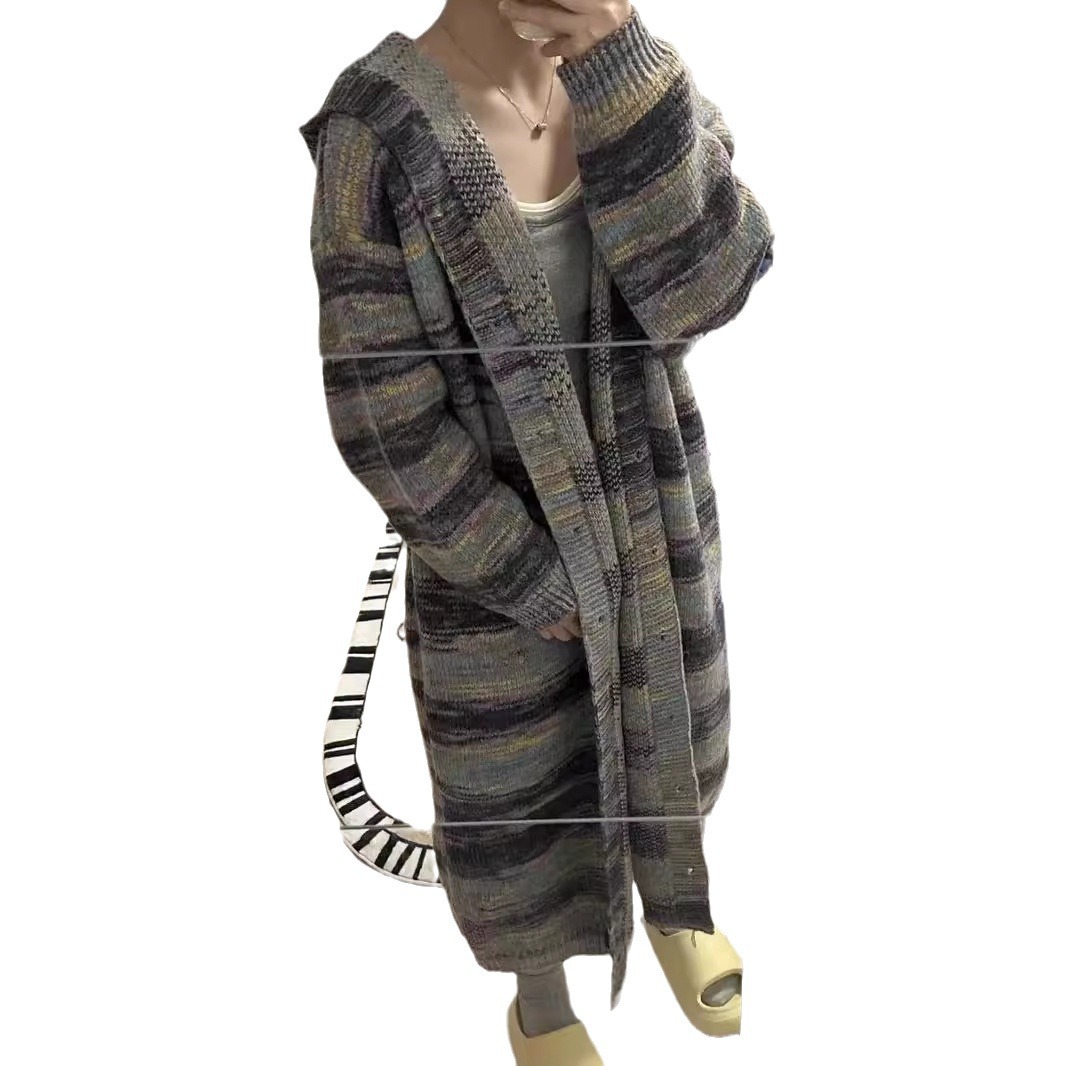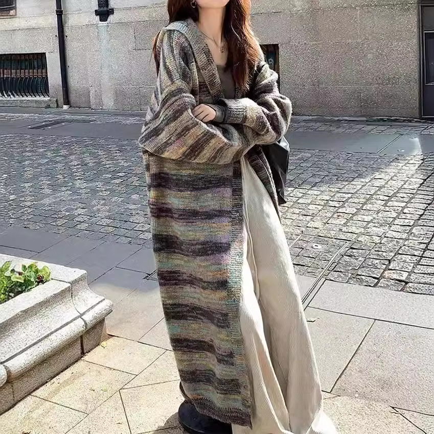 | nameOriginal | 2024 autumn and winter new color matching striped sweater cardigan women's long knitted coat lazy loose hooded coat |