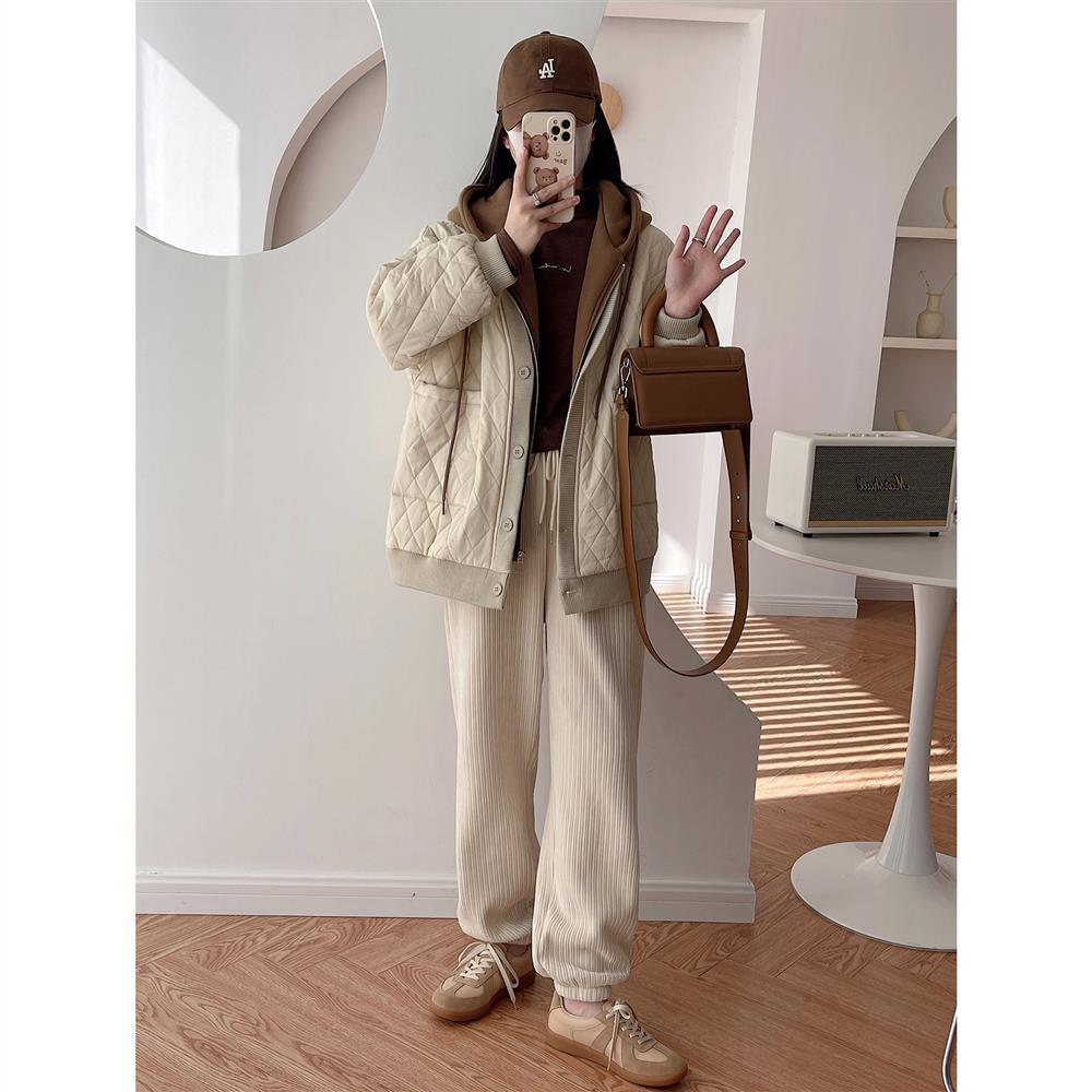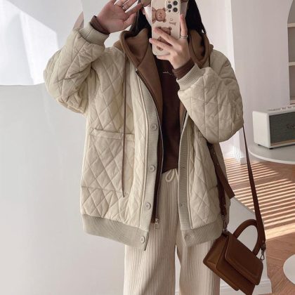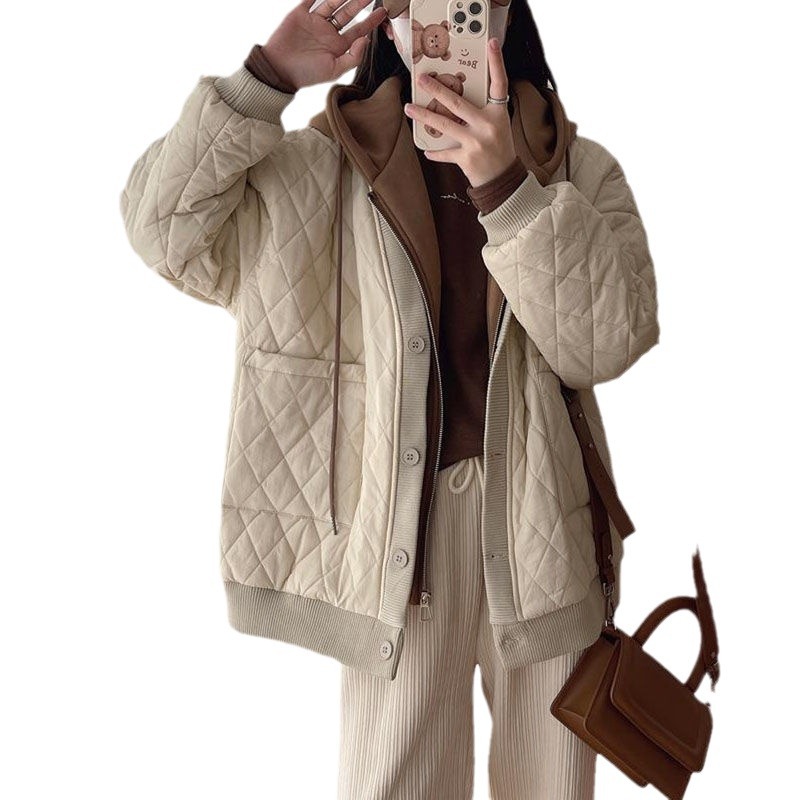 2024 Autumn and Winter New Fashion Hepburn Style Rhombic Stitching Fake Two-piece Hooded Thickened Cotton Clothes Trendy Women