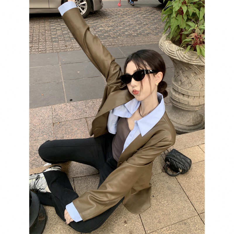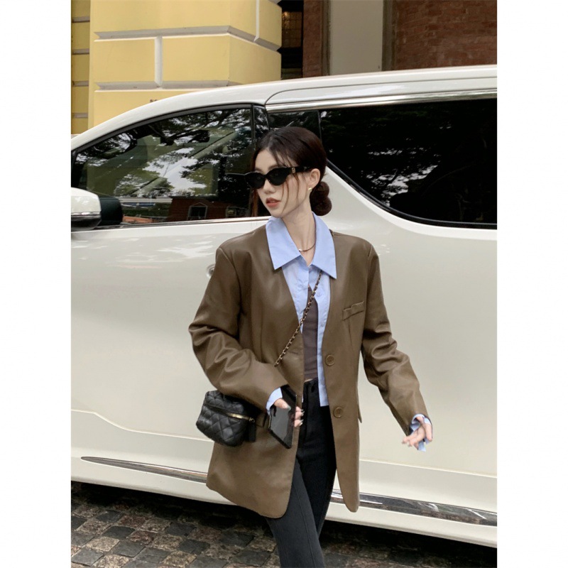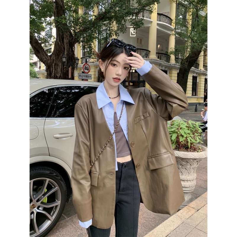 | nameOriginal | 2024 Autumn Design Sense Lapel Fake Two-piece Leather Coat Women's Early Autumn Design Sense Niche Loose Slimming Top |