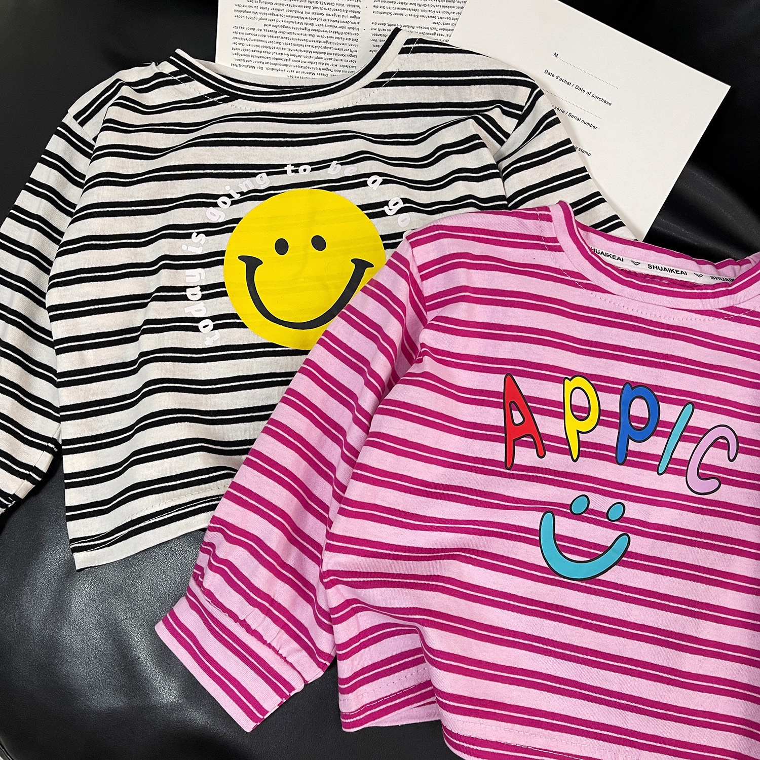 2024 Autumn New Korean style girls’ striped smiley face printed long-sleeved bottoming shirt children’s casual long shirt wholesale