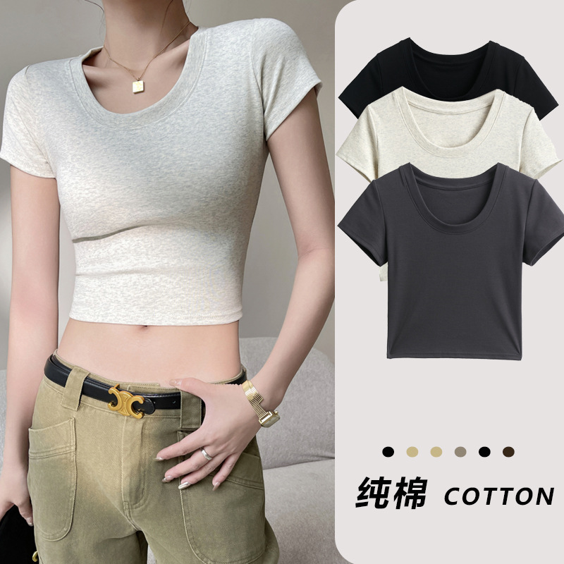 2024 Cotton Shoulder Short-Sleeved T-Shirt Women’s Spring and Summer Wear Spice Girl Short Slim-Fit American Style Cool Top