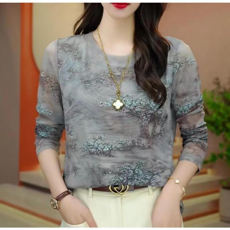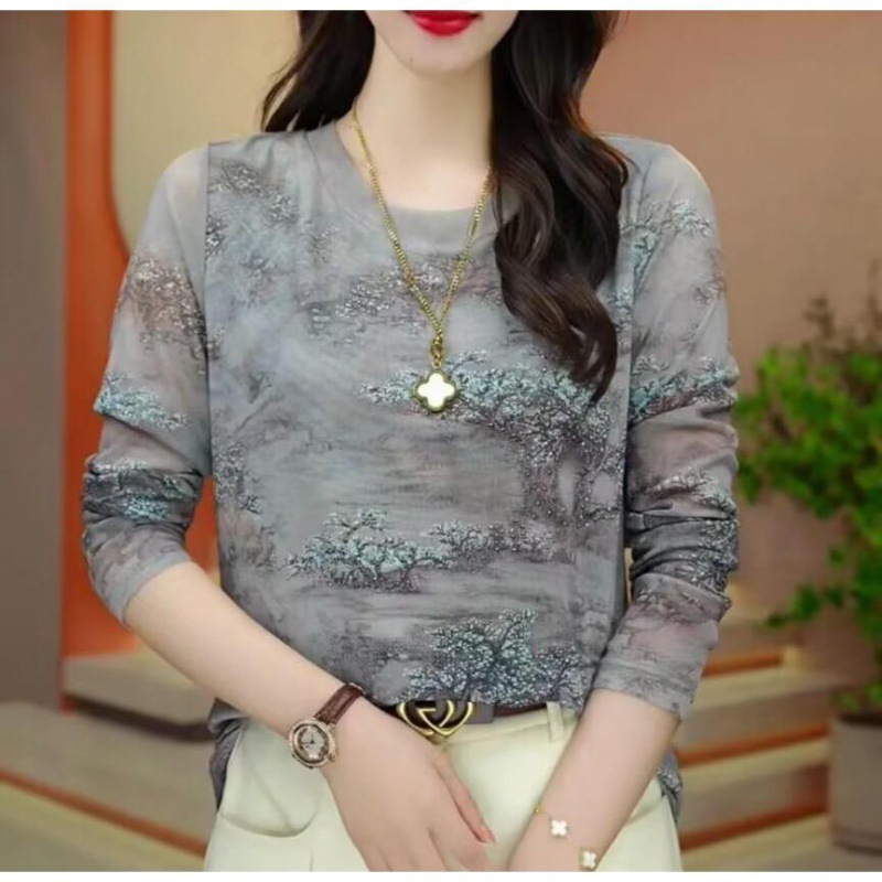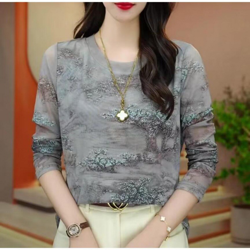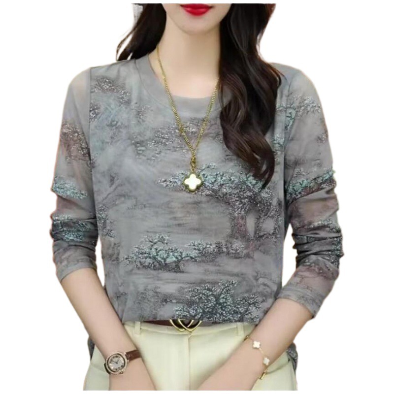 2024 Crewneck Mesh Long-sleeved Base Shirt Women's Printed High-end Autumn New Stylish Top Fashionable T-shirt