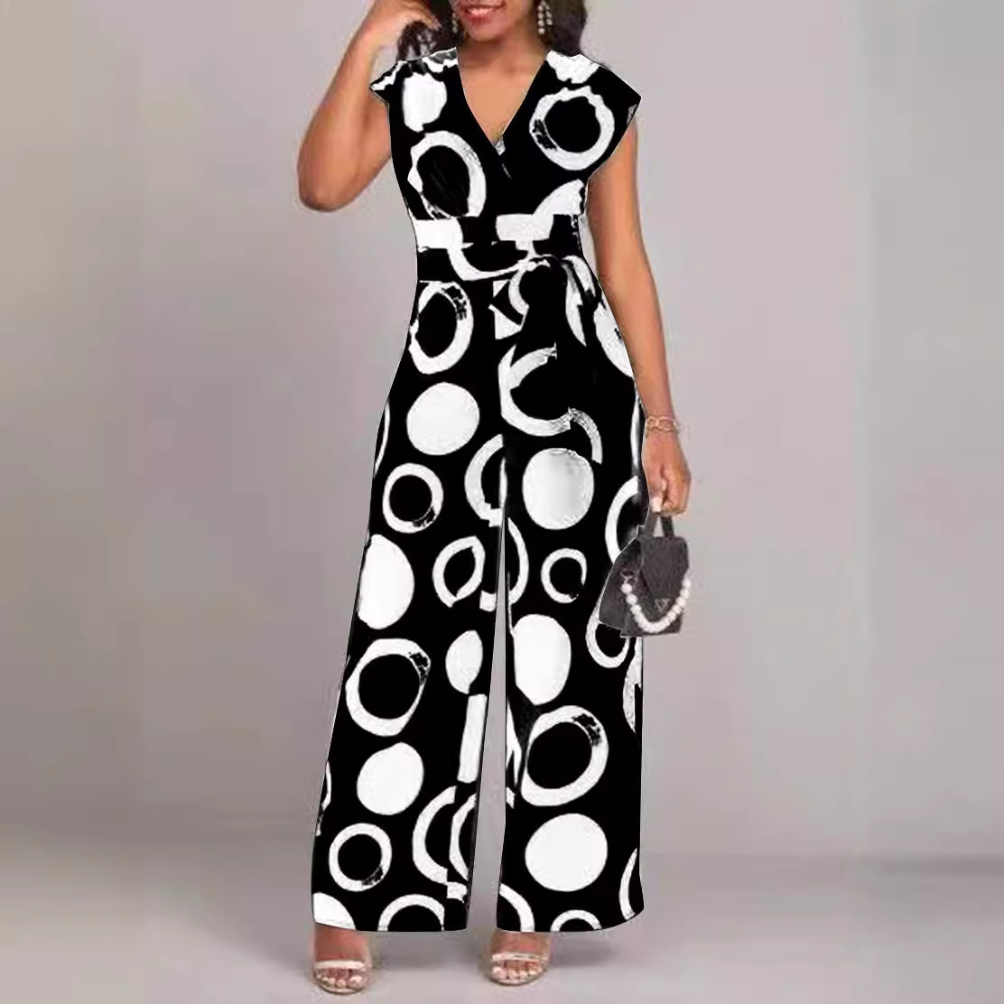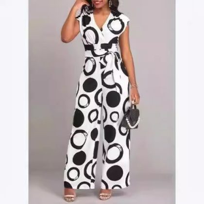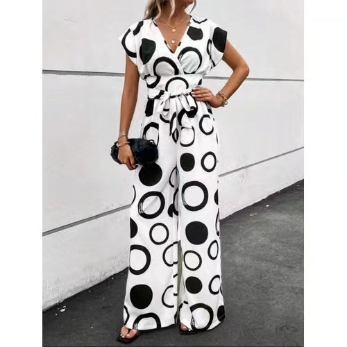 | nameOriginal | 2024 Cross-border European and American New Amazon Fashion Elegant Casual V-neck High Waist Printed Wide Leg Belt Pants |