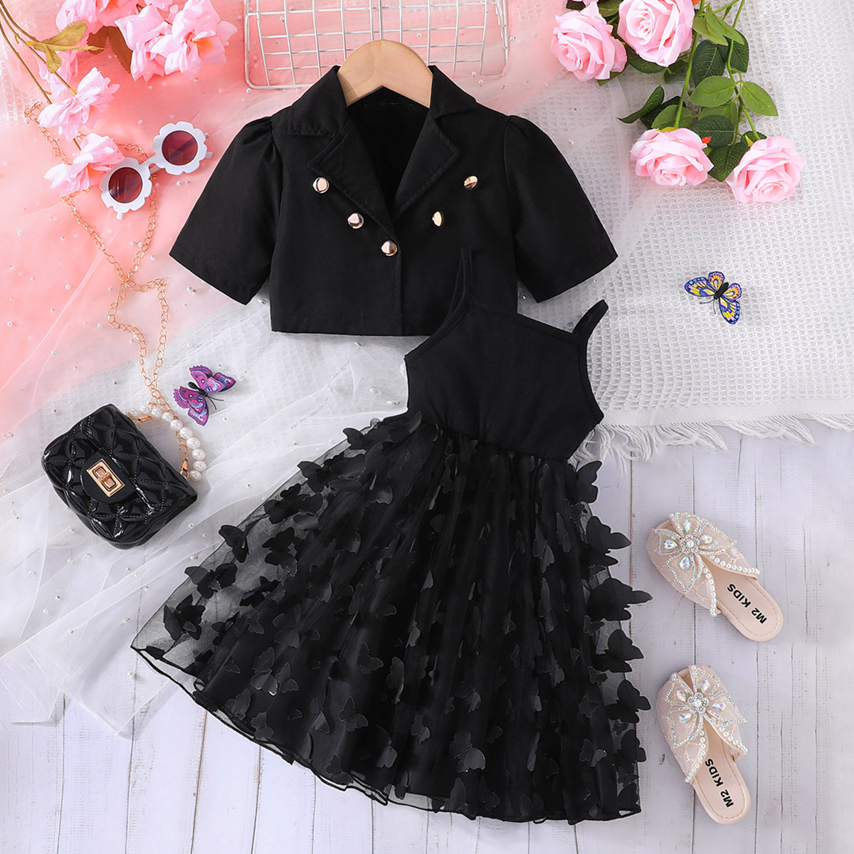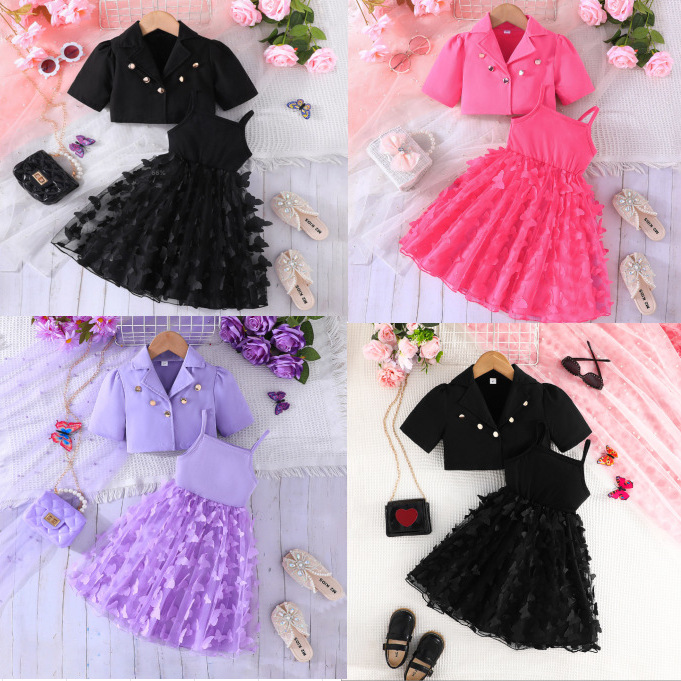 | nameOriginal | 2024 cross-border girls' summer new short suit jacket + butterfly mesh suspender dress two-piece set in stock |