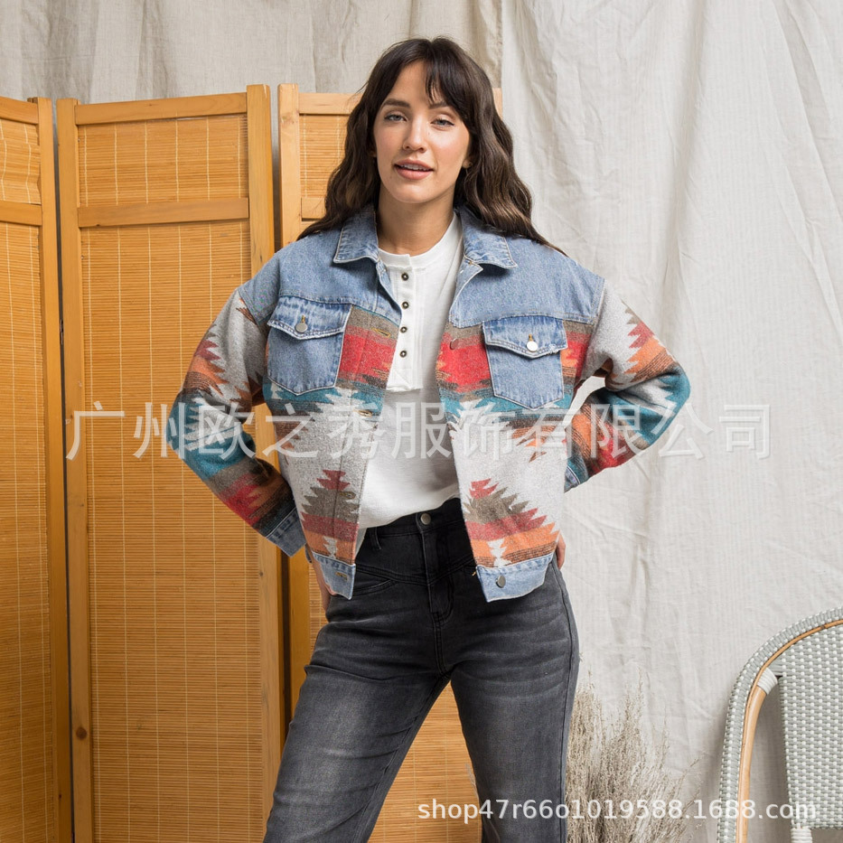 | nameOriginal | 2024 cross-border Spring and Autumn European and American women's single row multi-buckle AZTEC ethnic style printed coat woolen stitching Denim top |