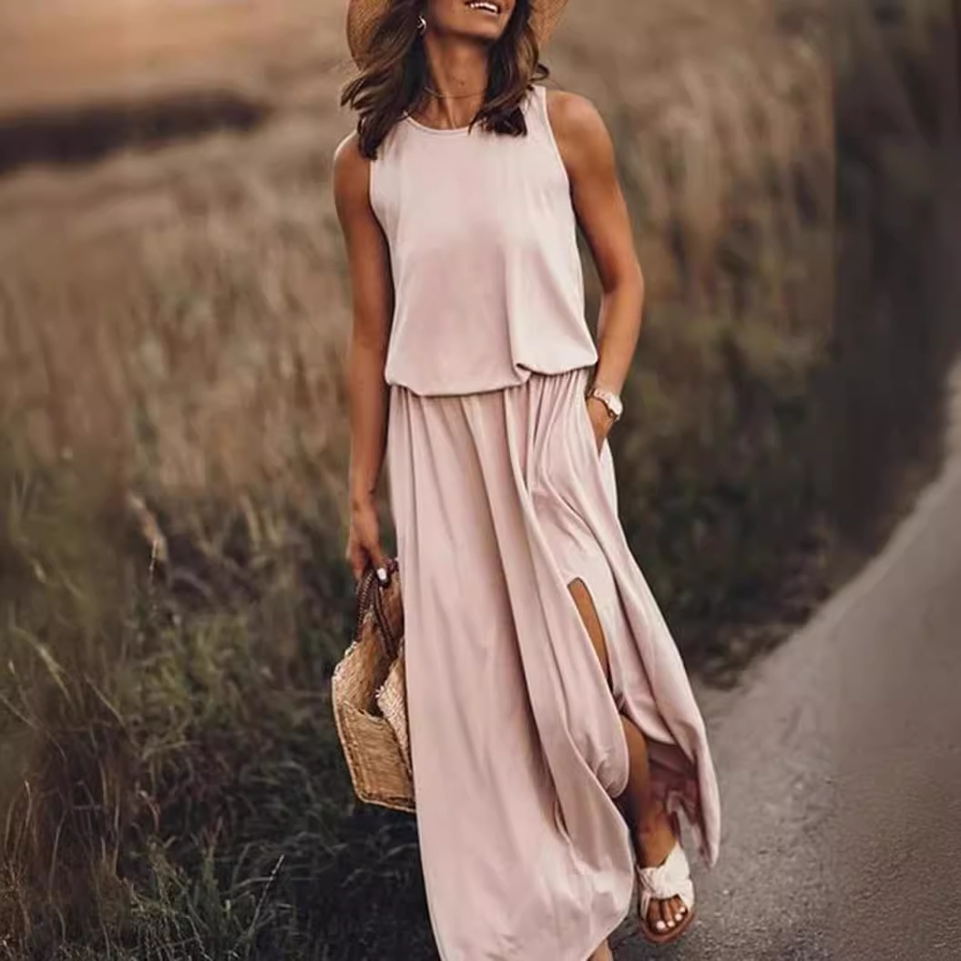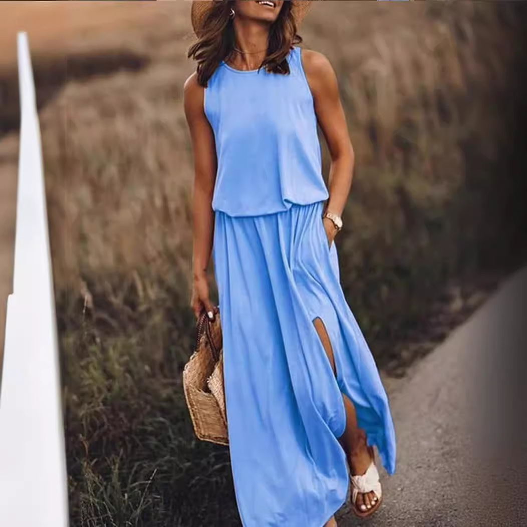 2024 Cross-border Spring and Summer New European and American Foreign Trade Women’s Round Neck Sleeveless dress Split Solid Color Casual Commuter Dress