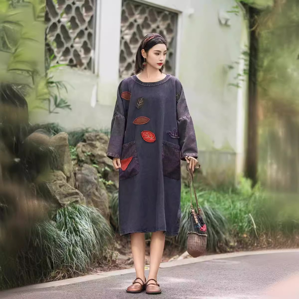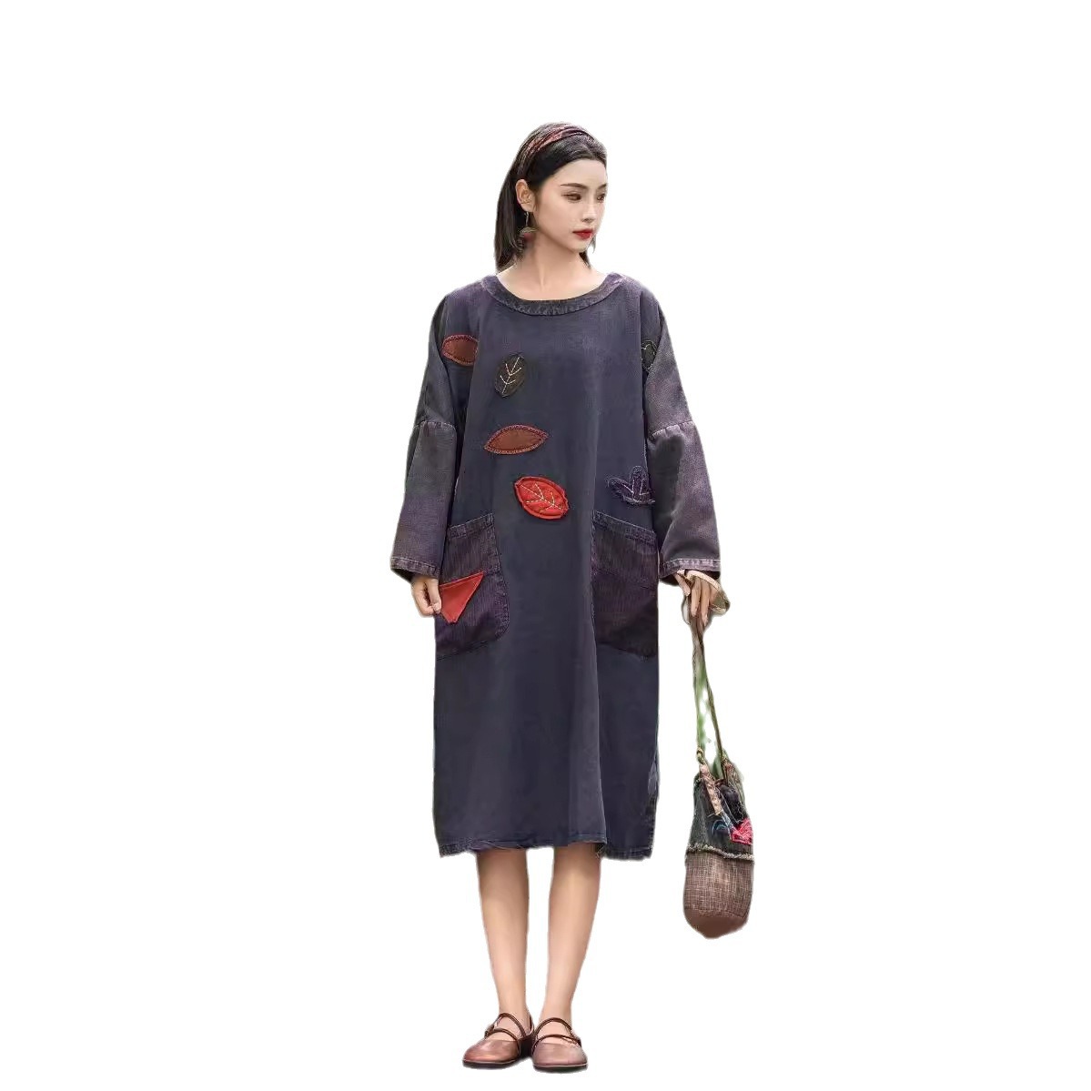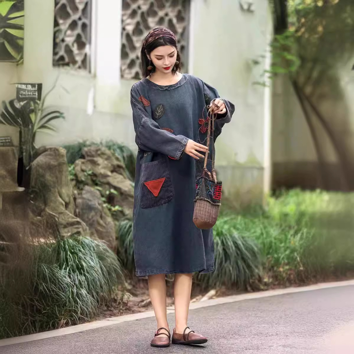 | nameOriginal | 2024 Early Autumn New Artistic Retro Loose Round Neck Patchwork Midi Denim Robe Midi Dress Top |