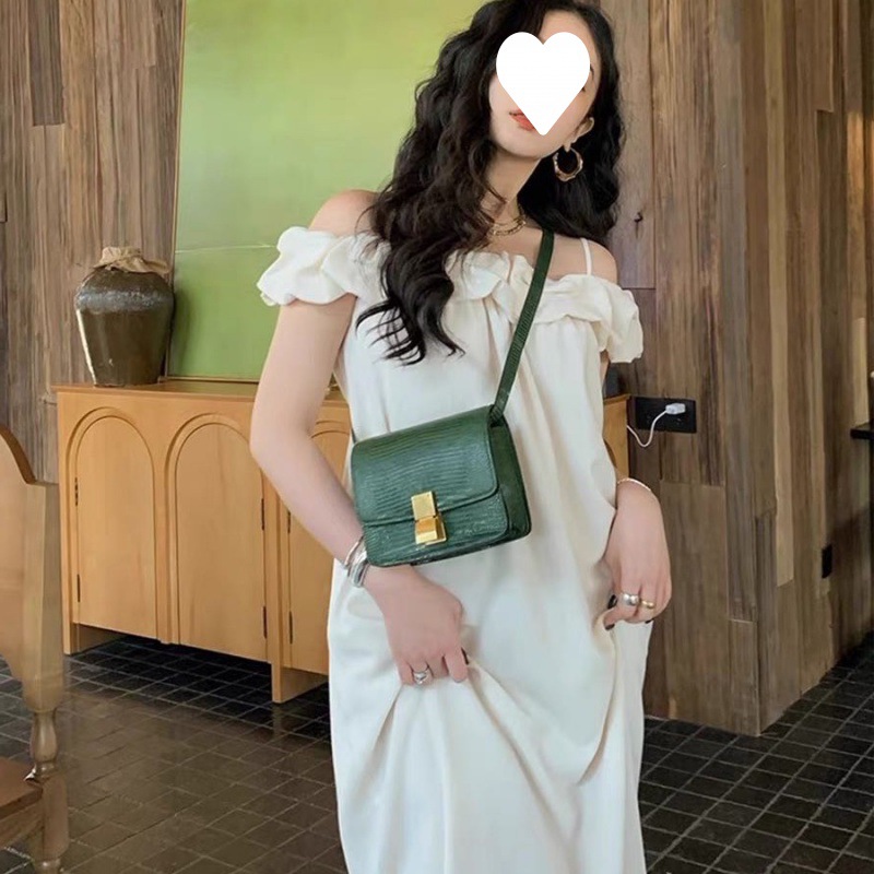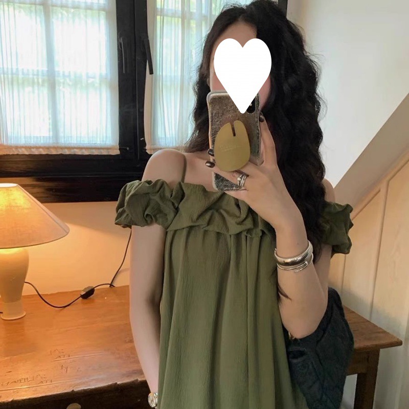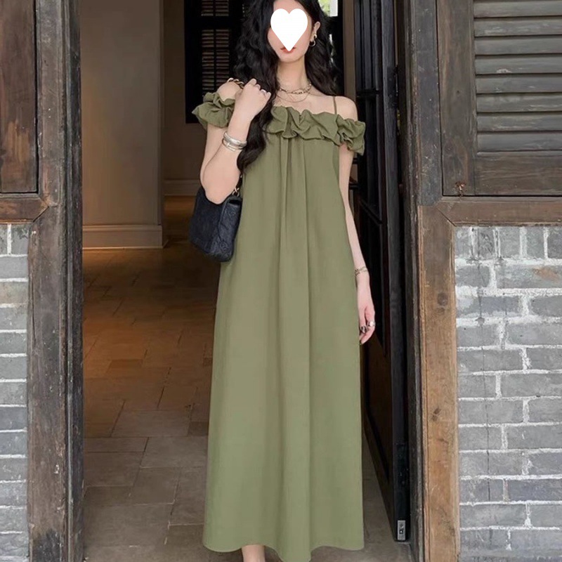 | nameOriginal | 2024 Early Spring Explosions avocado green Summer New Shoulder Belt Dress Retro Design A- word Meat Covering Long Dress |