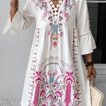 2024 Europe and America Amazon Cross-border Women’s Summer New V-neck Lace Stitching Casual All-match Printed dress