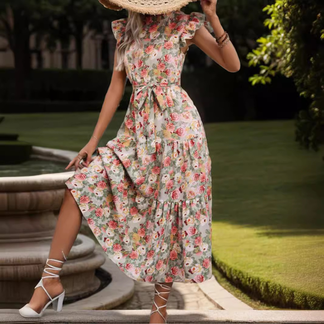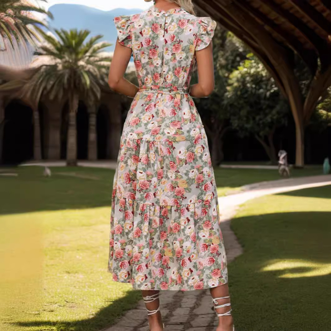 | nameOriginal | 2024 Europe and the United States cross-border foreign trade women's AliExpress Amazon lace-up waist printed short sleeve ruffled dress |