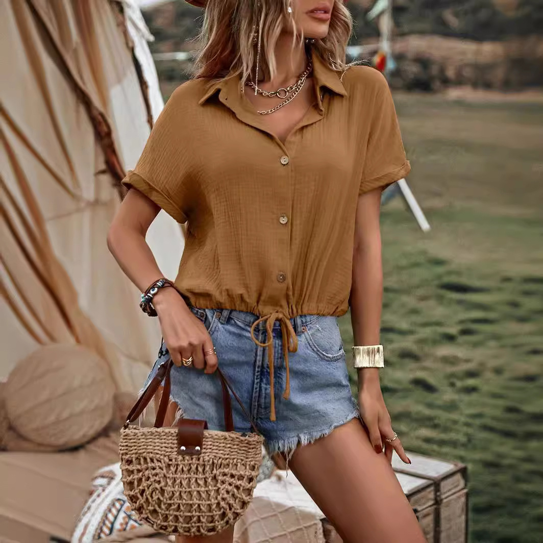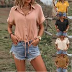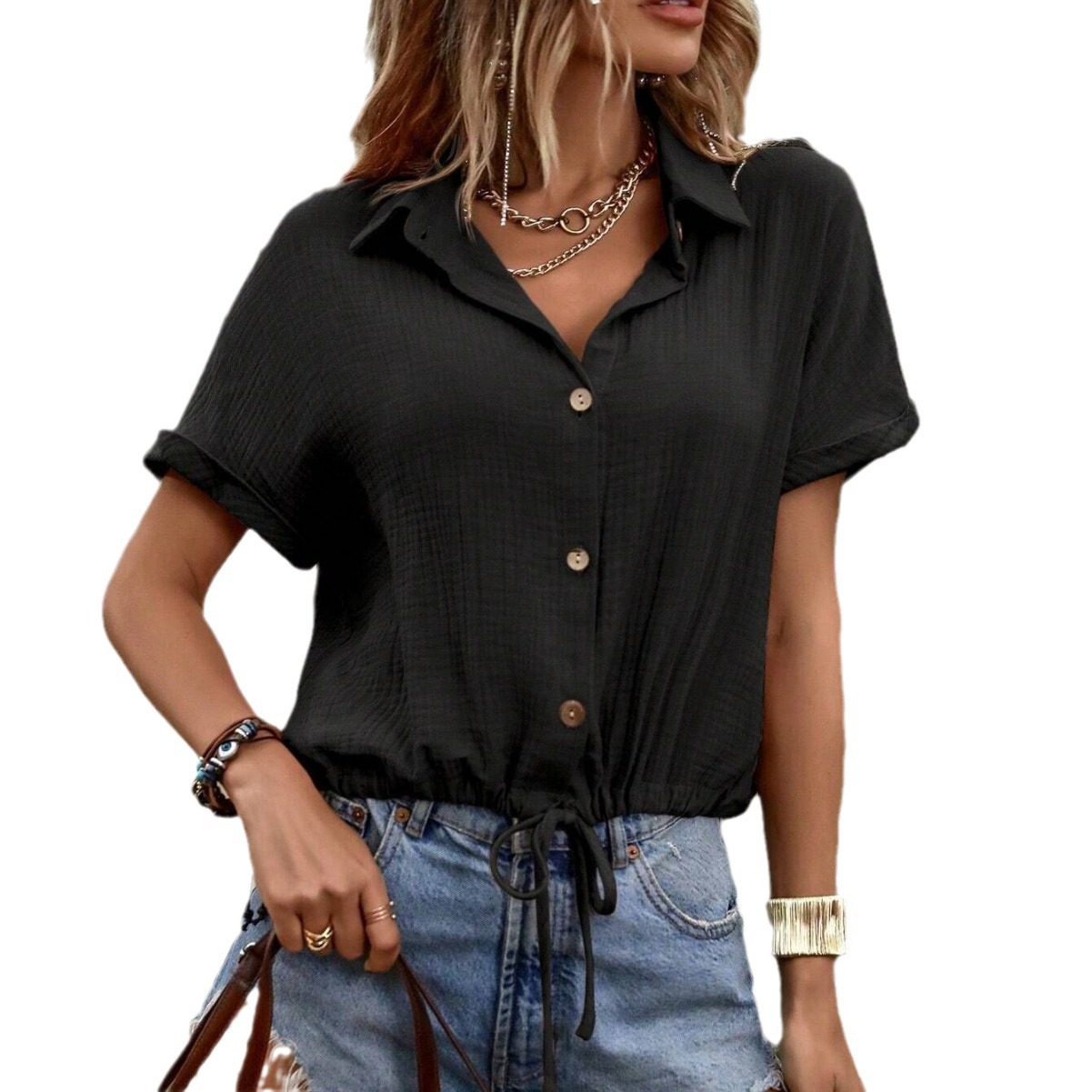 | nameOriginal | 2024 European and American Amazon cross-border women's clothing summer new solid color button cardigan lace-up short-sleeved shirt women's top |