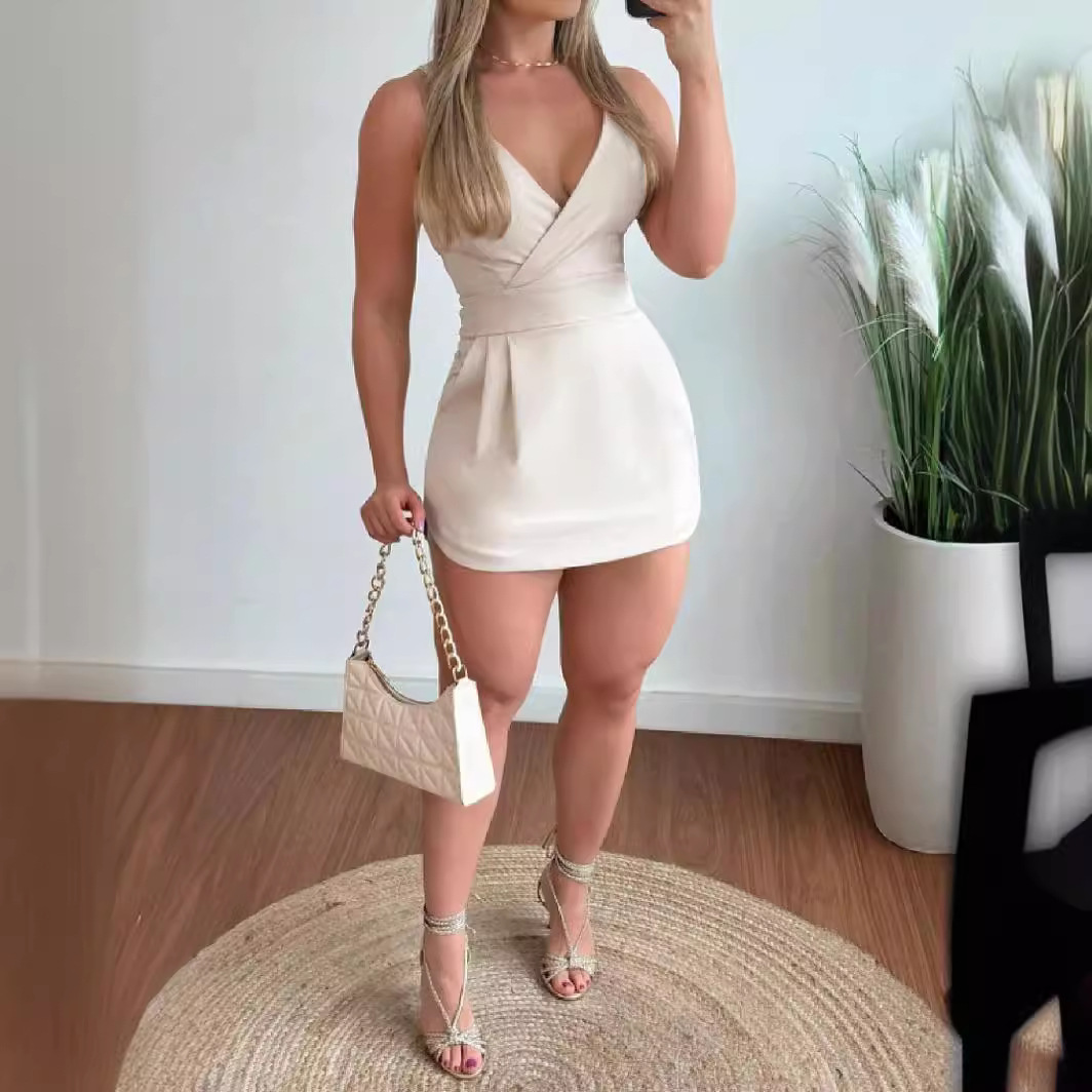 2024 European and American Amazon Fashion Solid Color Sling V-neck Short Skirt Pocket Backless Sexy Slim Dress