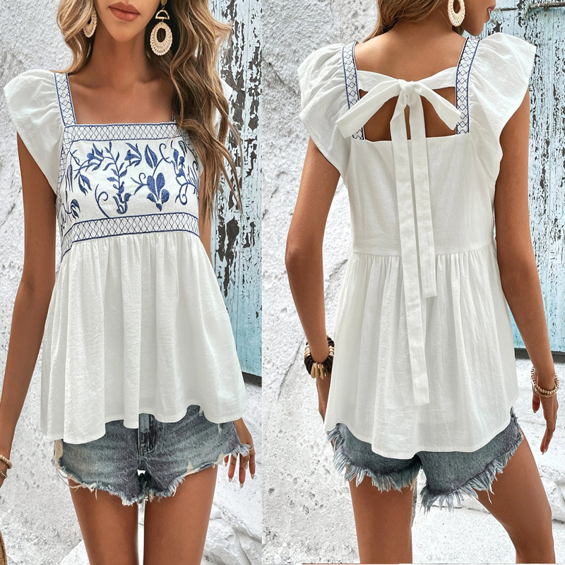 | nameOriginal | 2024 European and American cross-border Amazon women's clothing summer New embroidered lace-up Square collar flying sleeve ruffled top for women |
