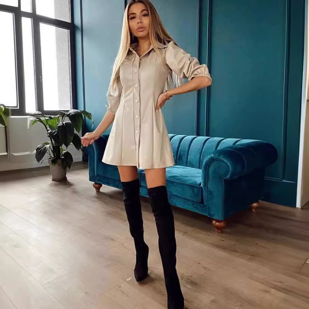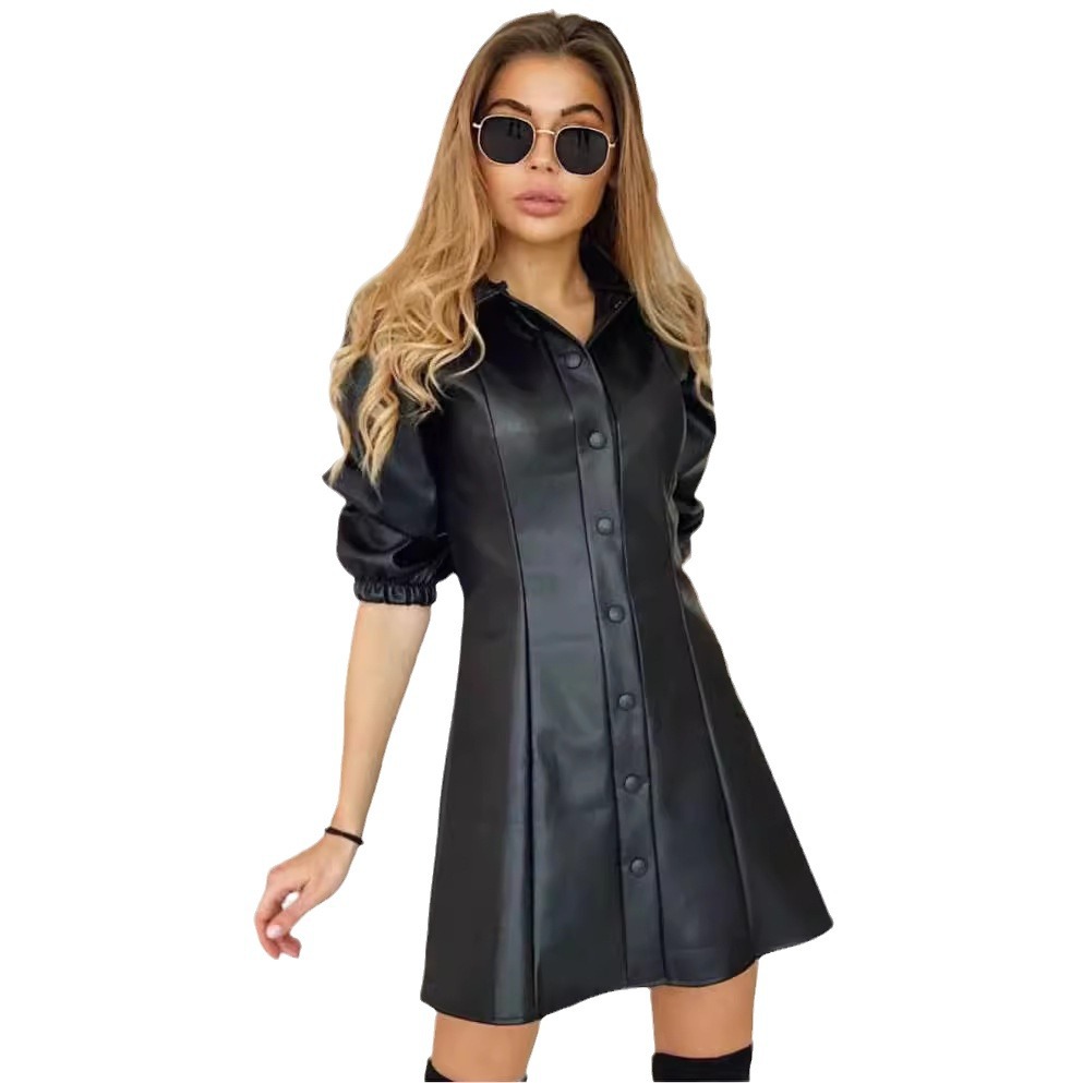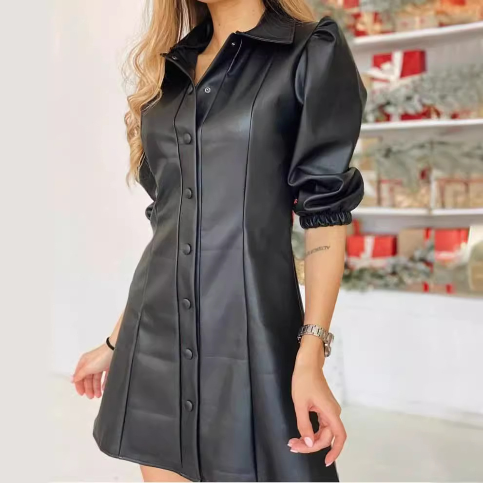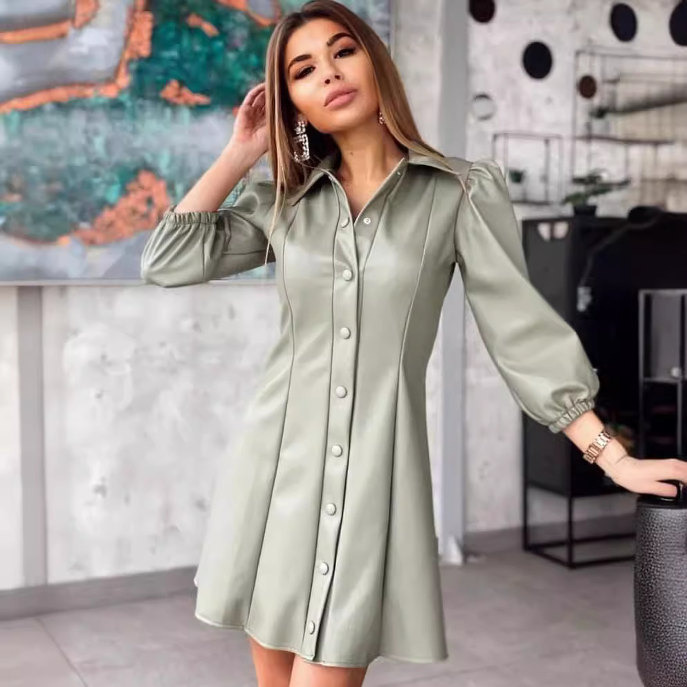 | nameOriginal | 2024 European and American Cross-border Women's Clothing Amazon Fashion Simple Leather Solid Color Seven-point Sleeve Slim Fit Shirt dress |
