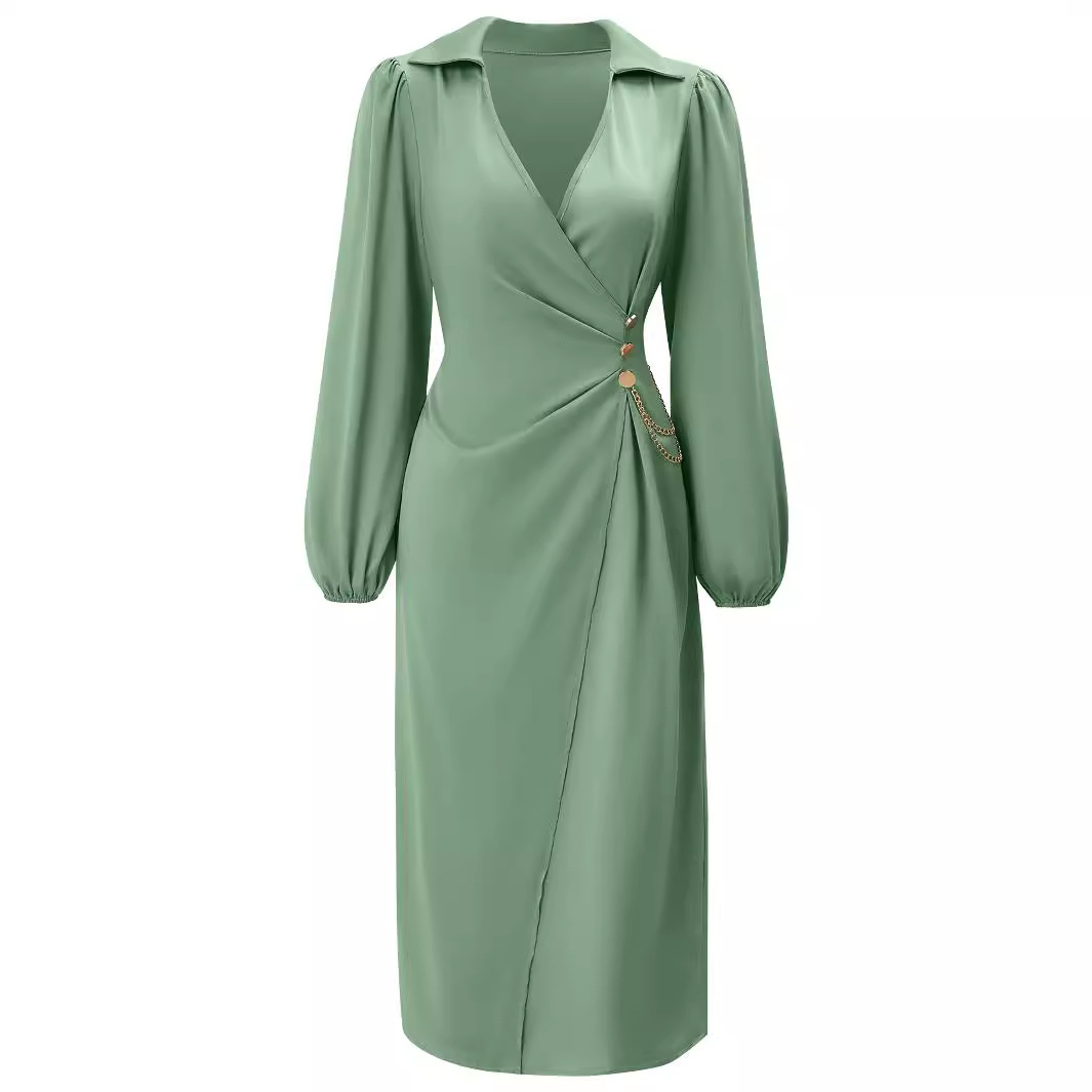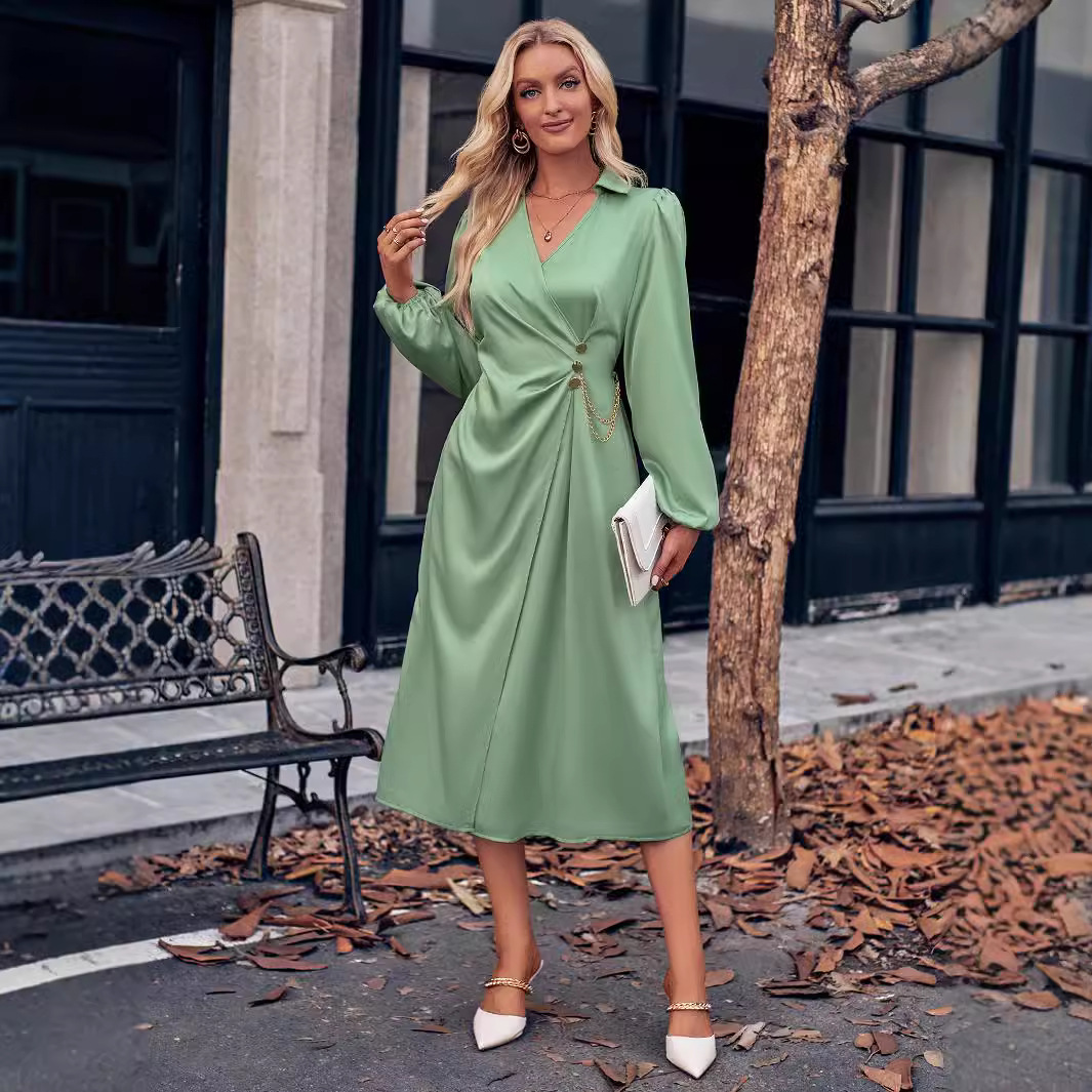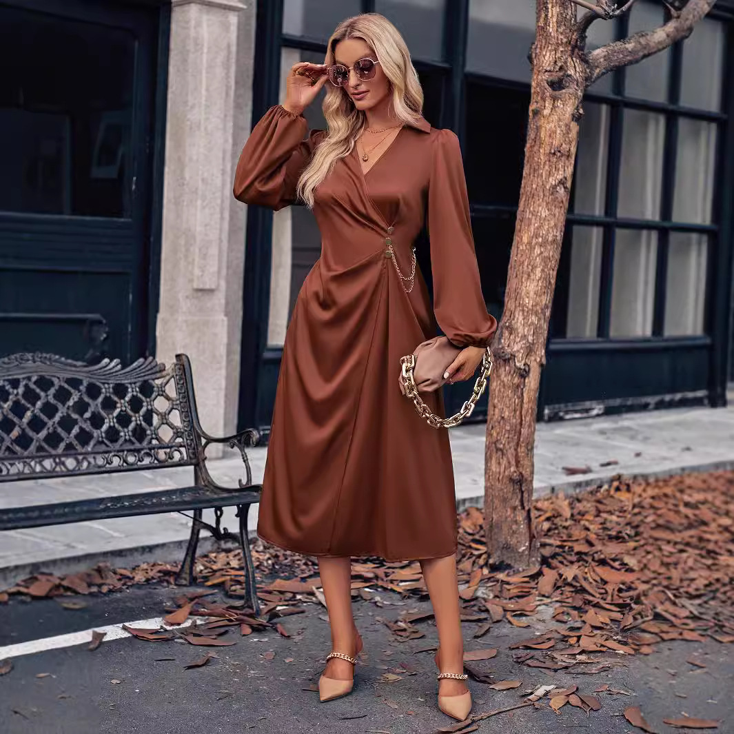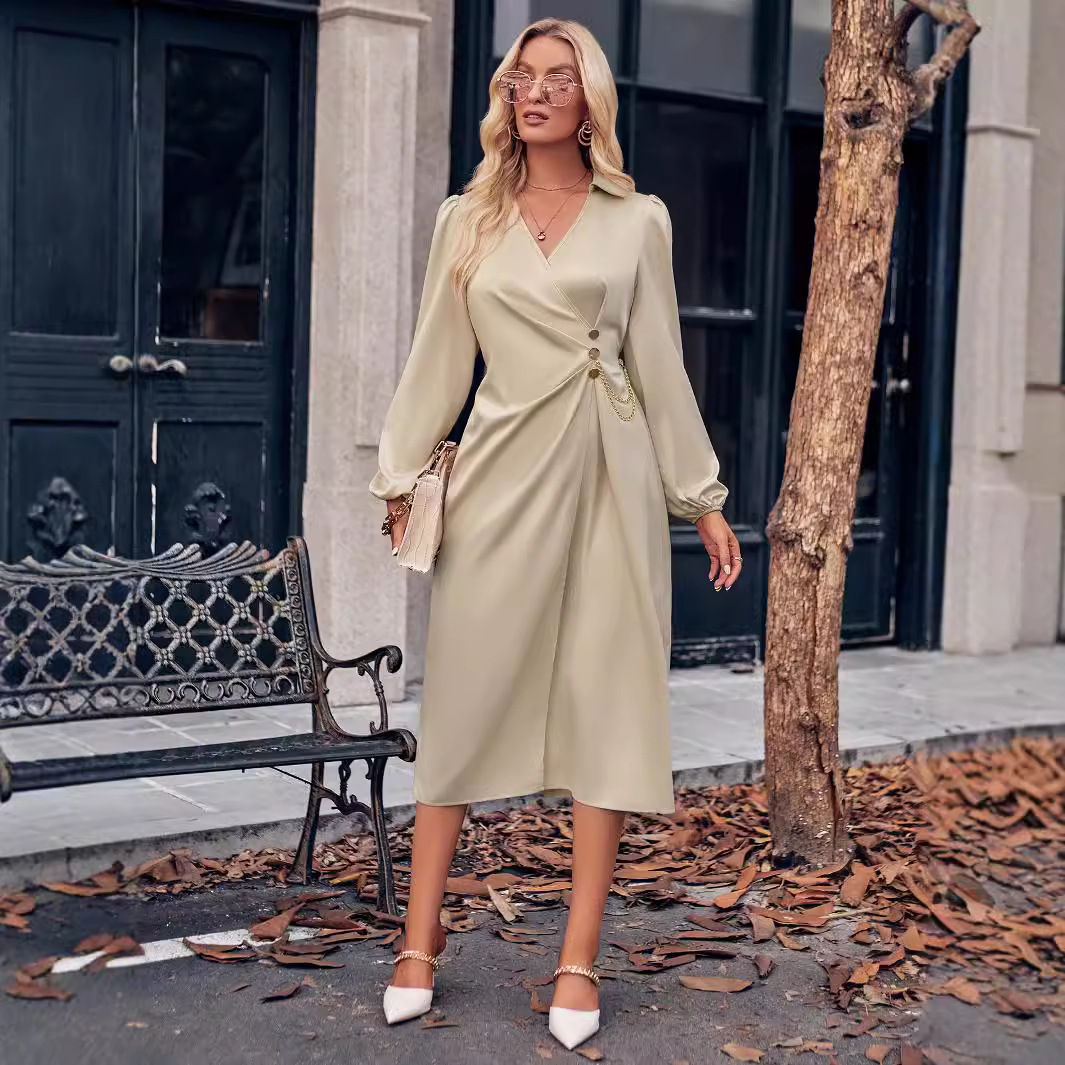 | nameOriginal | 2024 European and American leisure autumn and winter women's clothing Amazon foreign trade fashion V-neck solid color waist dress women |