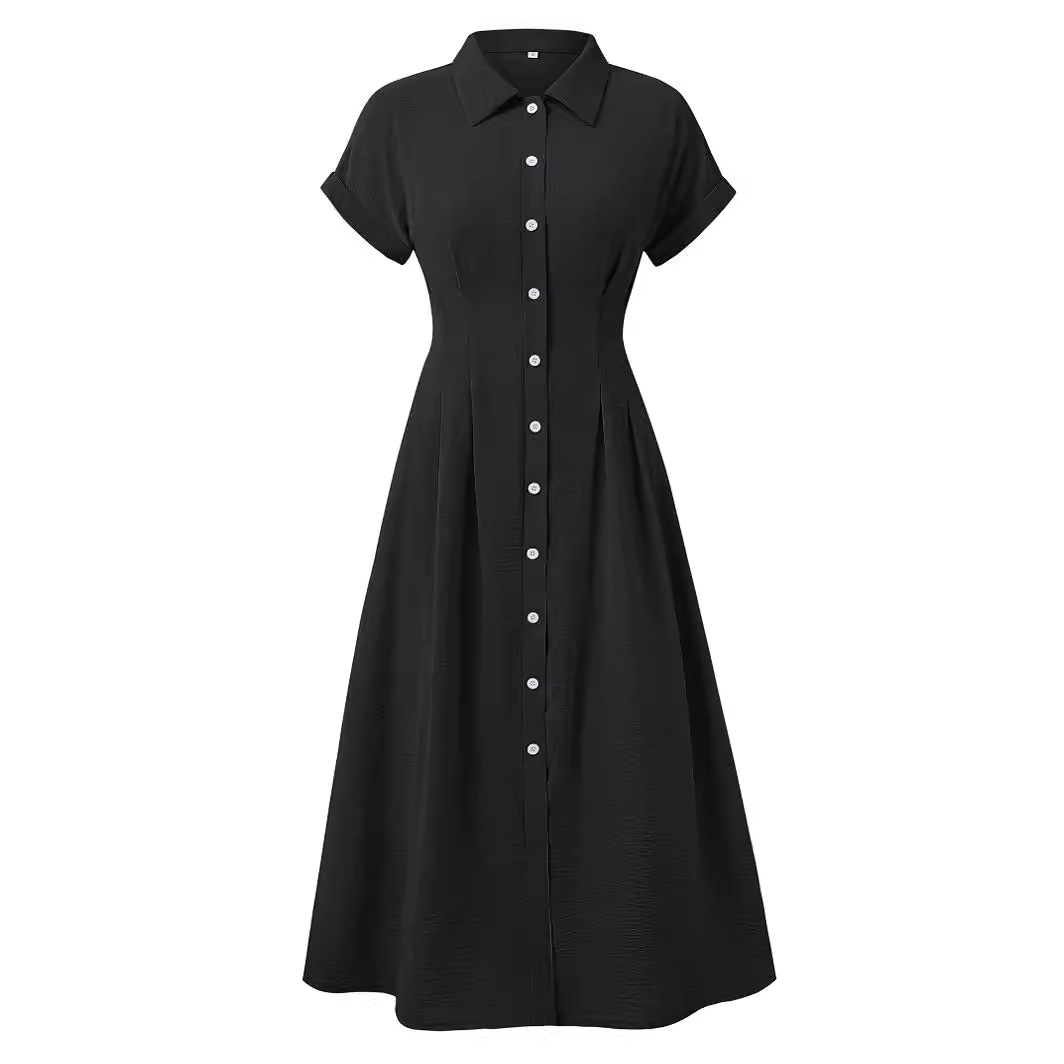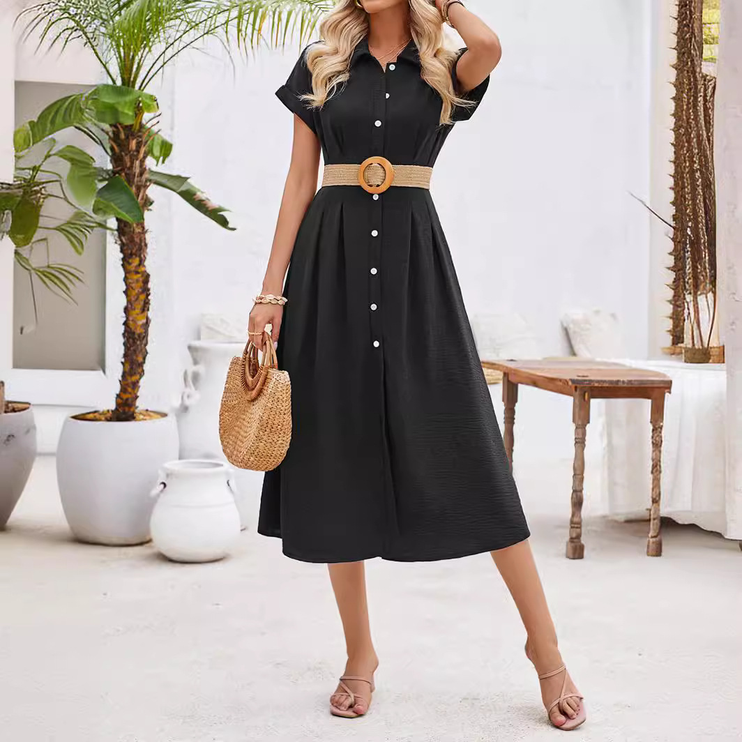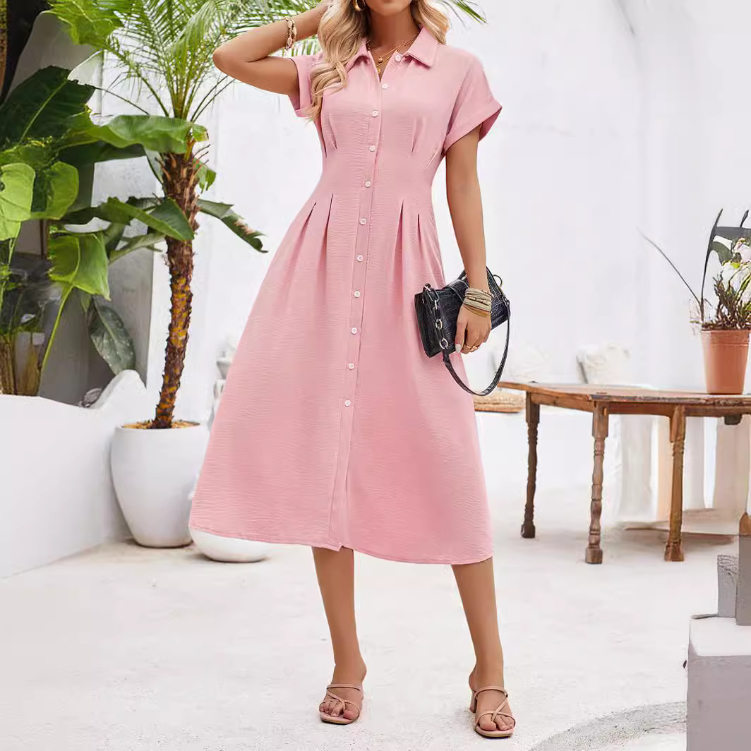 | nameOriginal | 2024 European and American summer cross-border women's clothing independent station new solid color lapel single-breasted short sleeve pleated dress |