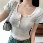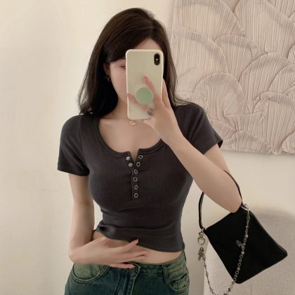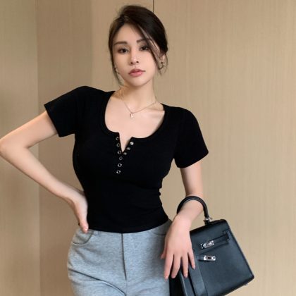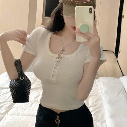 2024 Gentle Style Shoulder U-Neck Short-Sleeved T-Shirt Women’s Summer New Style Small Tight Slimming Short Base Top Trendy