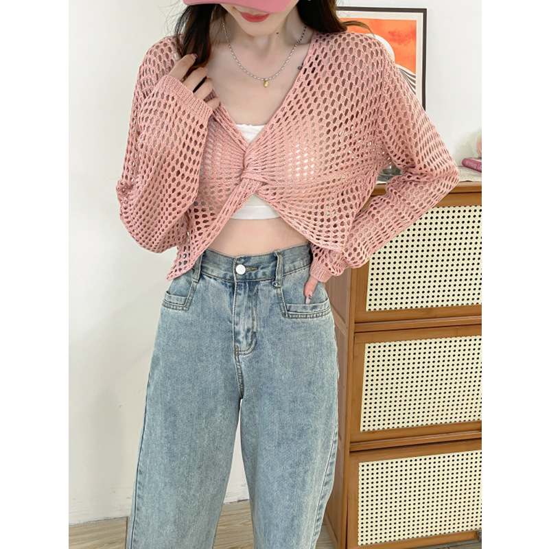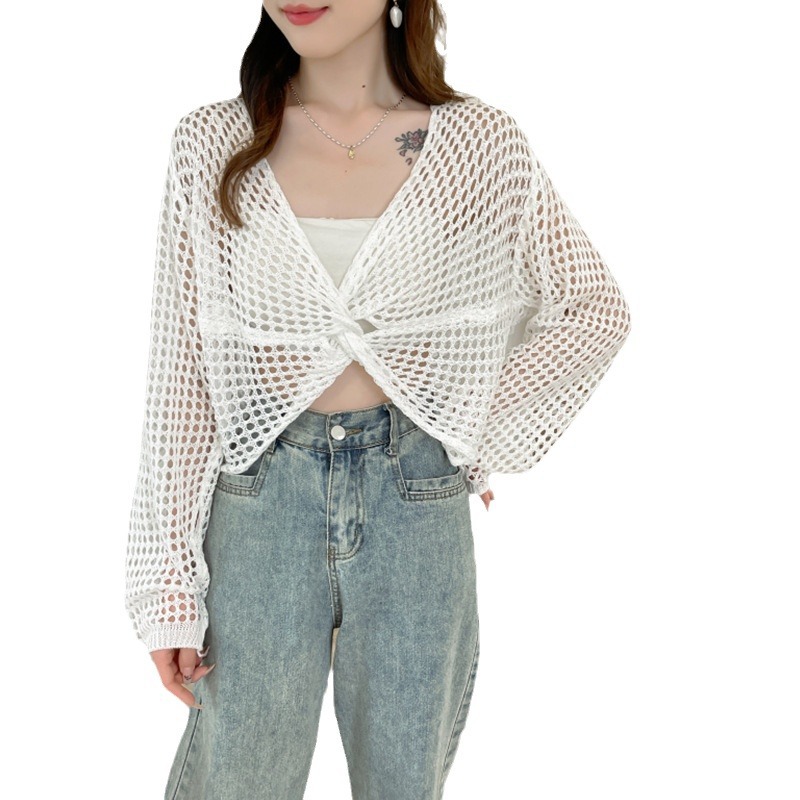 | nameOriginal | 2024 Hollow-out Long-sleeved Casual Blouse Knitted Top Women's Spring and Summer Thin Drawstring Lazy Style Design Western Style Shirt |