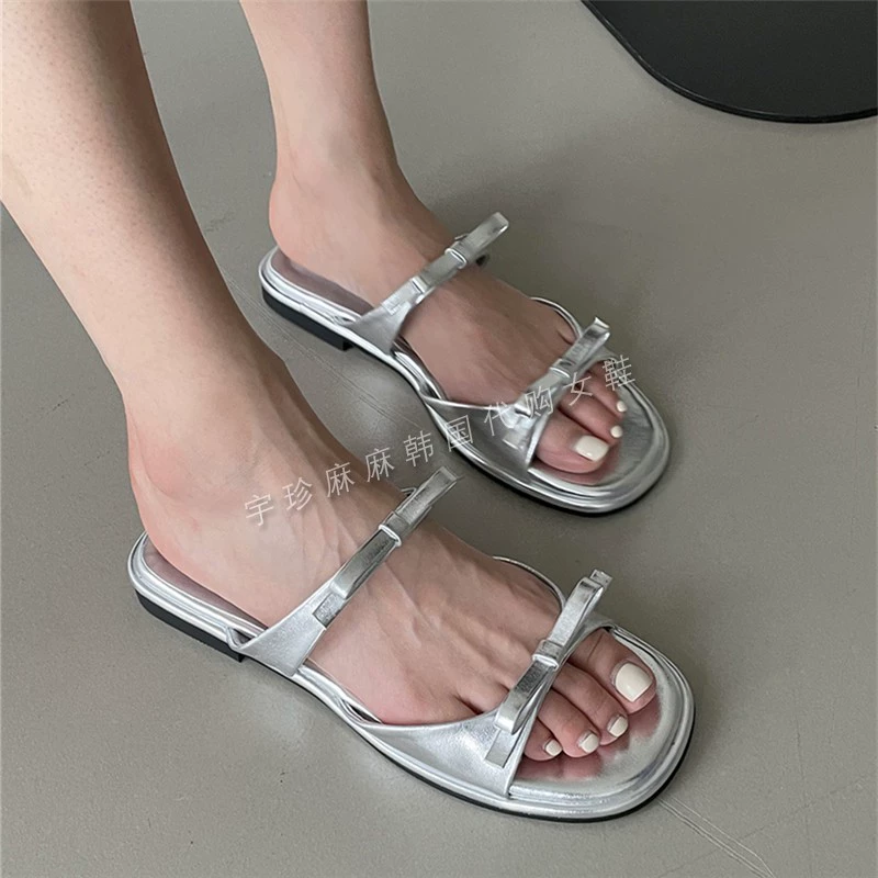 | nameOriginal | 2024 Korean pink temperament slippers for women, silver French one-strap French sandals, flat shoes, ballet style sandals |