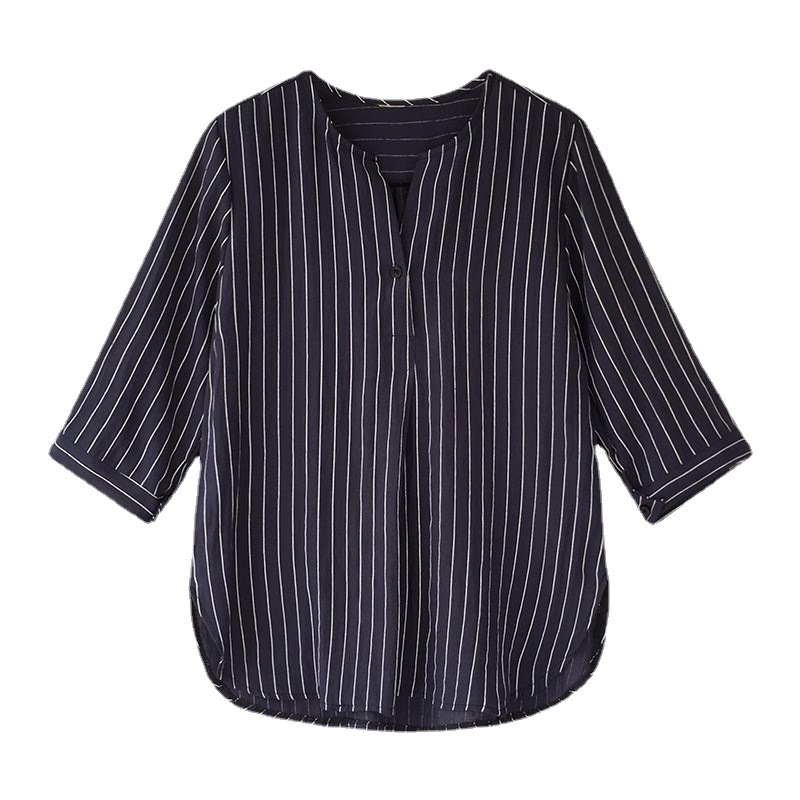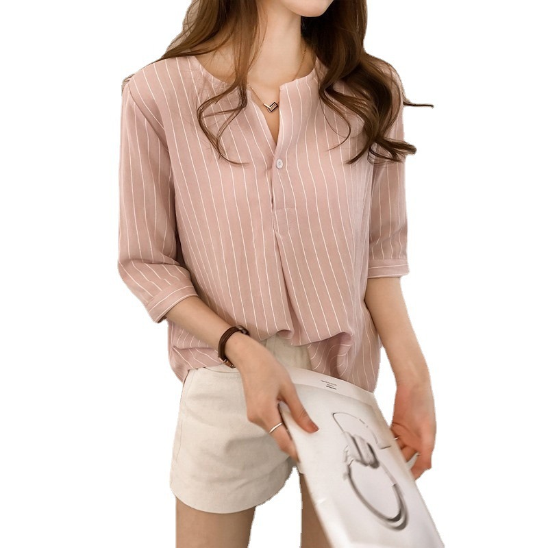| nameOriginal | 2024 Korean style casual shirt chubby girl loose plus size small V-neck one button three-quarter sleeve striped shirt for women |