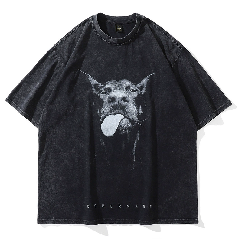 2024 Men's Gothic Short Sleeve T-Shirt Hip Hop Street Letter Dog Print Punk Summer Retro Washed Black Cotton