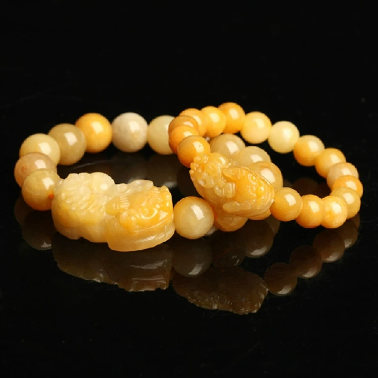 2024 Natural Old Topaz Stone Carved Pixiu Carrying Ancient Coins Bracelet Chain Gold Wire Huanglong Jade Piqiu Men and Women