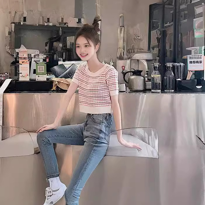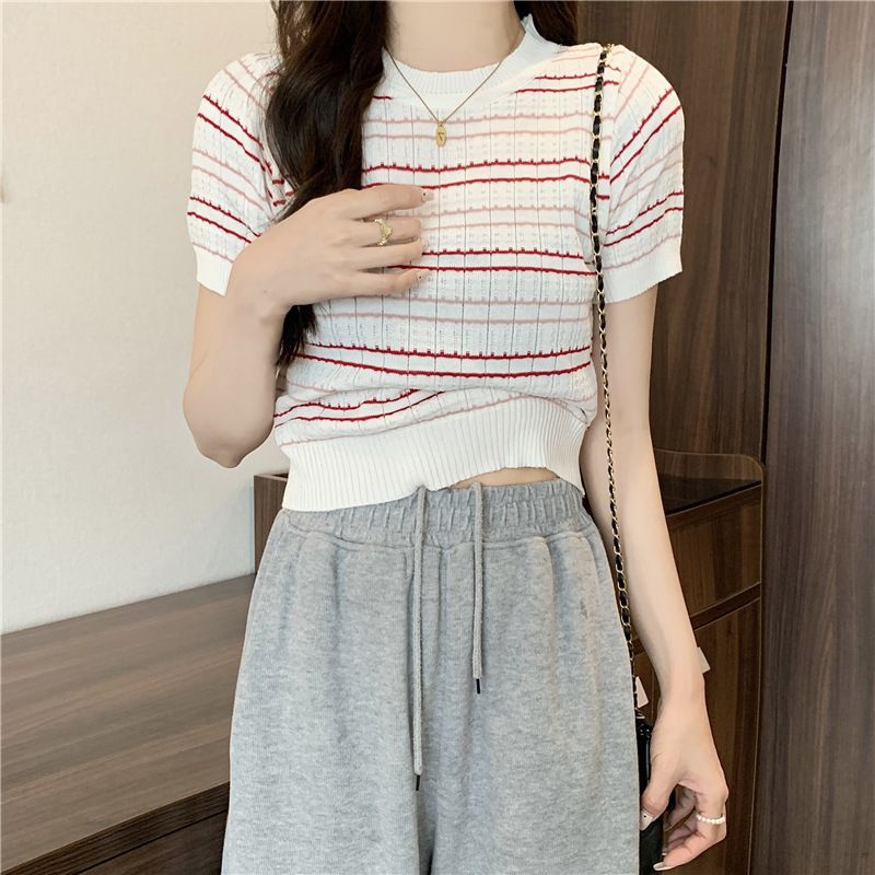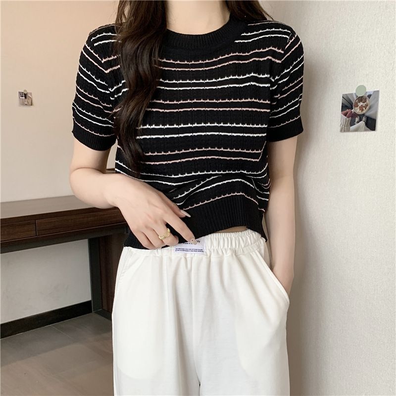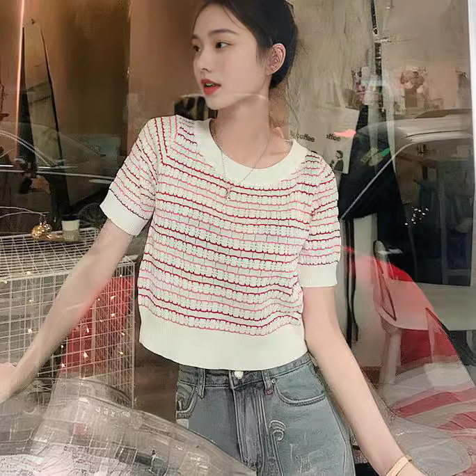 | nameOriginal | 2024 New Arrival Striped Knitted Short-Sleeved T-Shirt Women's Top Summer Thin Fashionable Stylish Short Base Shirt |