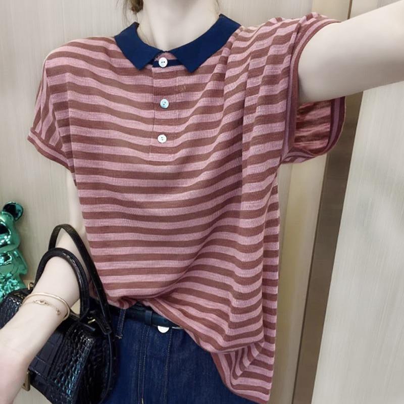 | nameOriginal | 2024 New Arrival Wide-Shoulder Short-Sleeved T-Shirt Women's Summer Thin Striped Top All-Match Polo Shirt T-Shirt |