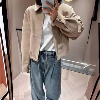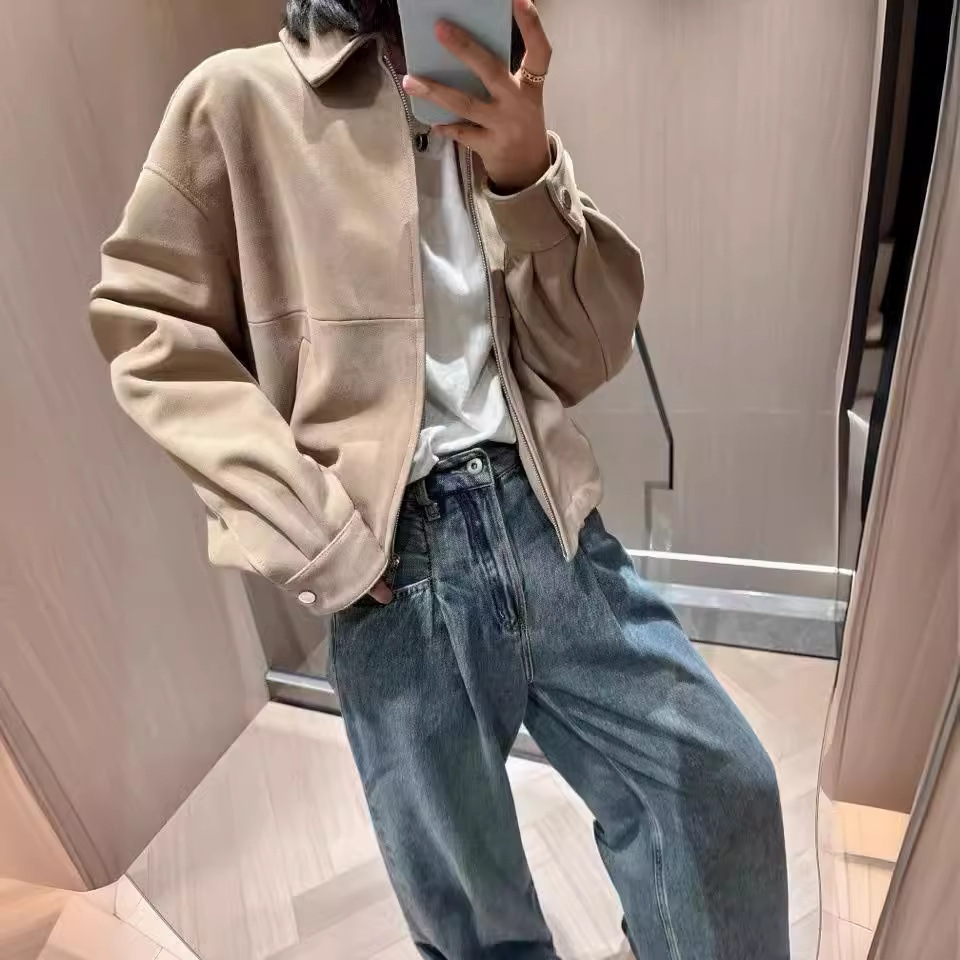 2024 New Autumn and Winter Haining Genuine Leather Women's Loose Imported Goatskin Suede Short Lapel Jacket Coat