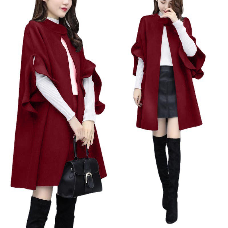 2024 new autumn and winter Korean version of plus size long woolen coat women’s red British A- shaped cape woolen coat