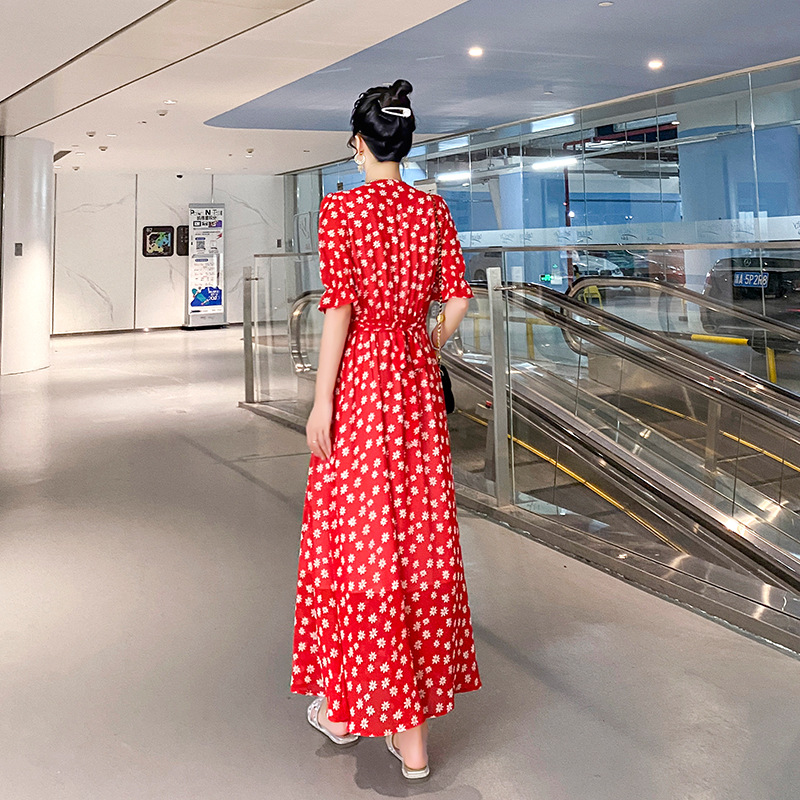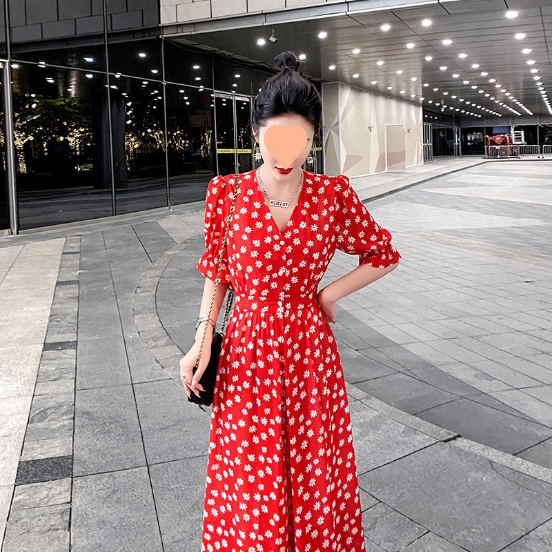 | nameOriginal | 2024 New Chiffon Floral V-neck Short-sleeved Dress Women's Summer Daisy French Retro Slim-fit Slimming Long Dress |