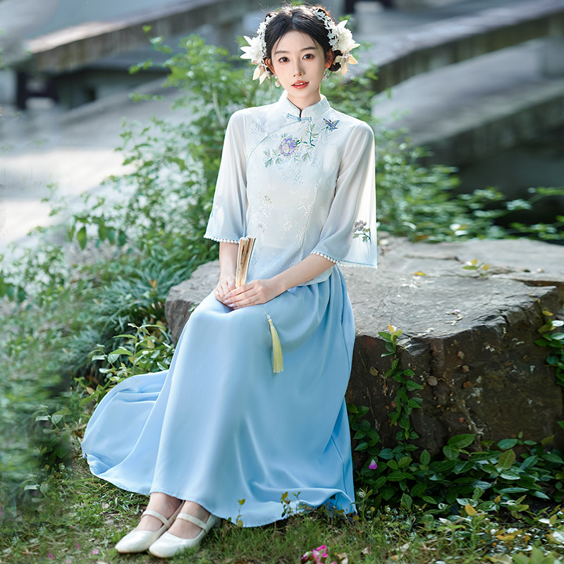 2024 New Chinese Embroidered Collar Lace Mid-Sleeve Modified Cheongsam Vintage Ethnic Style Top Skirt Women's Suit
