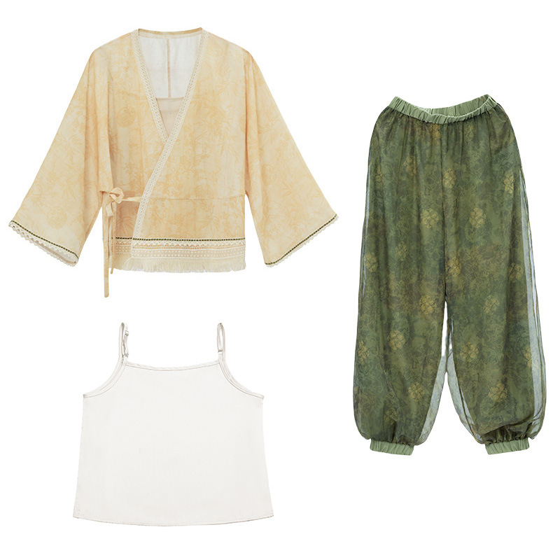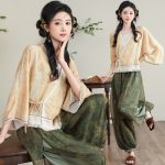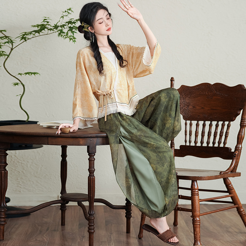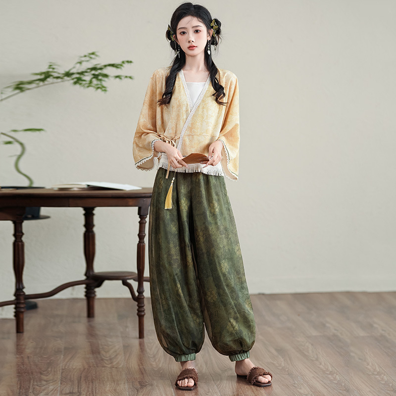 2024 New Chinese Style Retro Classical V-Neck Lace-Up Cardigan Top Classical Modified Ancient Rhyme Bloomers suit