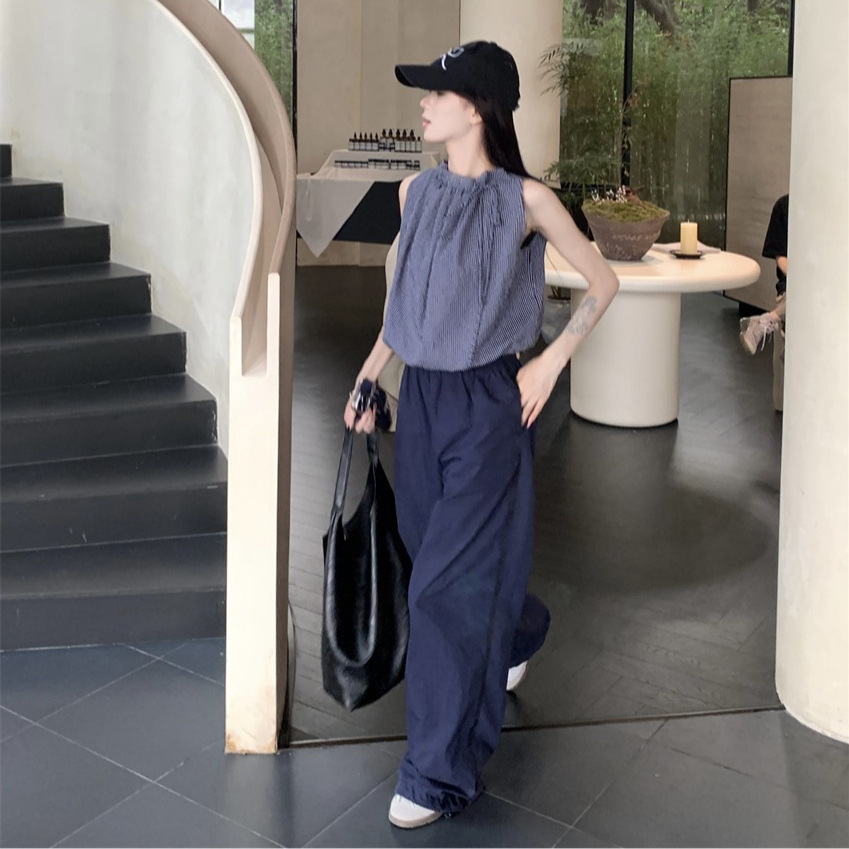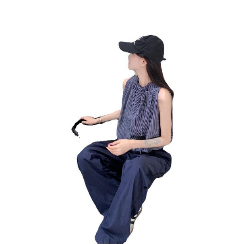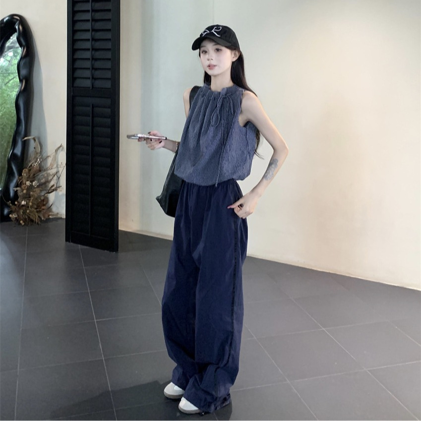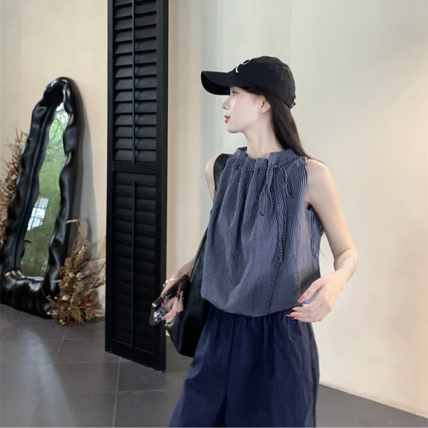 | nameOriginal | 2024 New Design Sense Strap Niche Pleated Short Top Retro Blue Plaid Sleeveless Shirt Women's Summer |