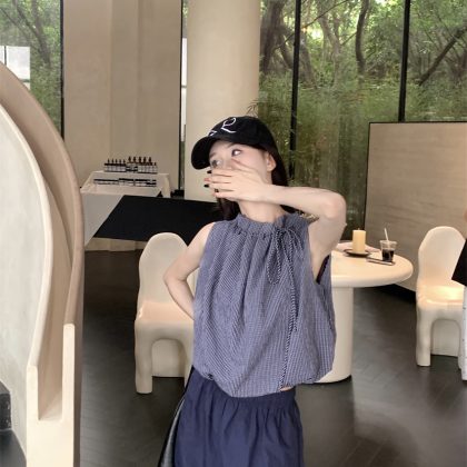 | nameOriginal | 2024 New Design Sense Strap Niche Pleated Short Top Retro Blue Plaid Sleeveless Shirt Women's Summer |