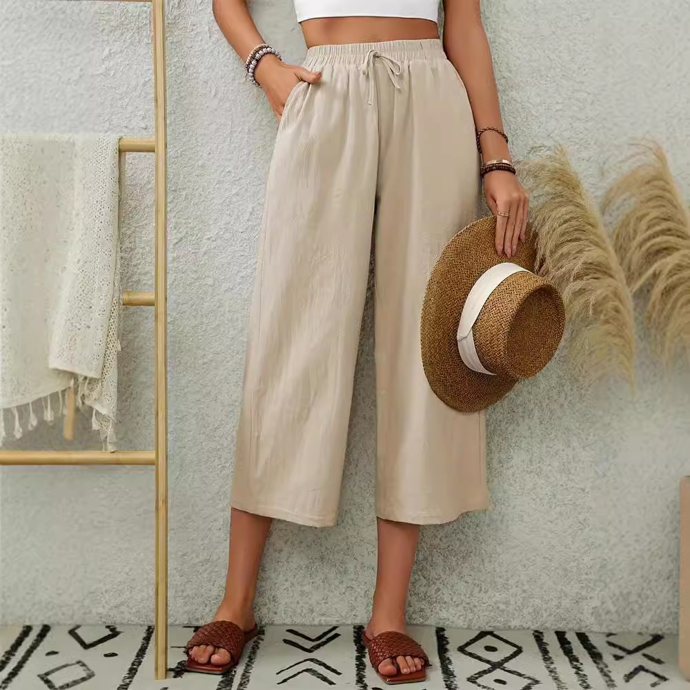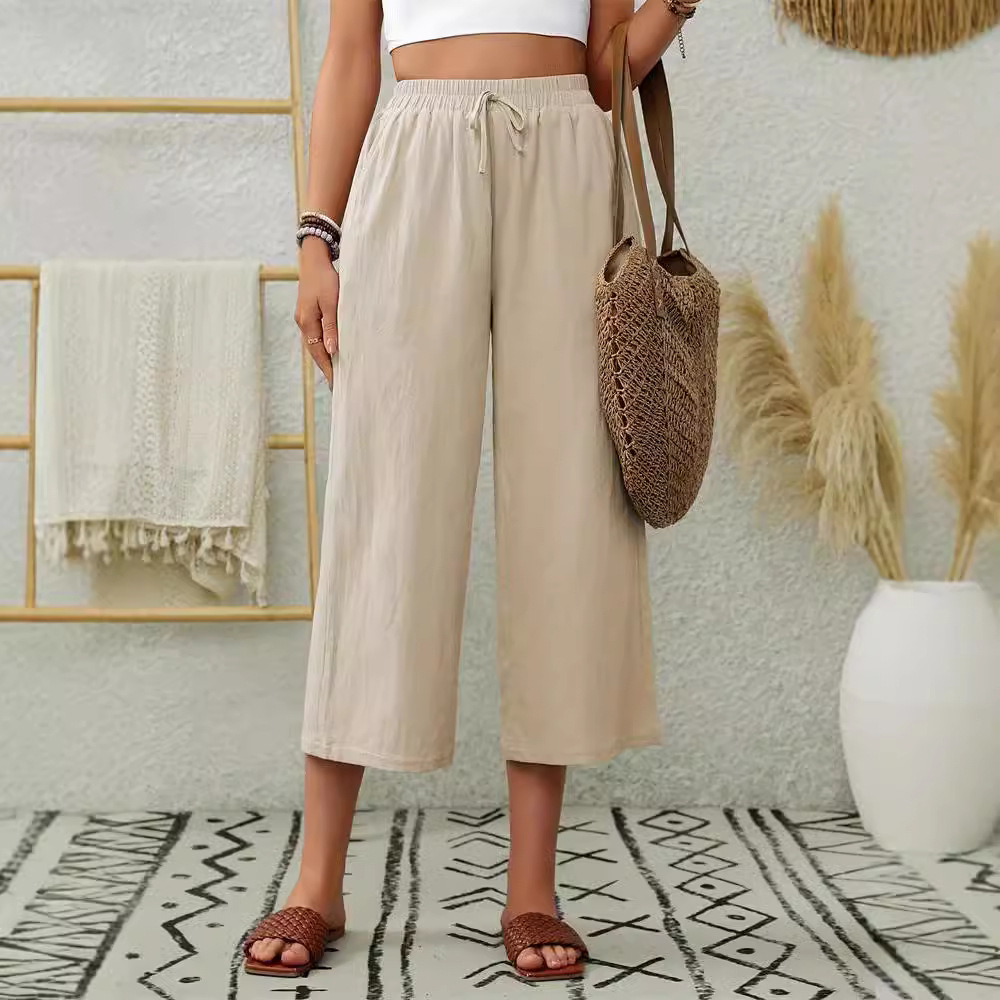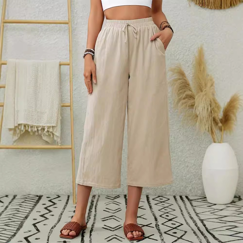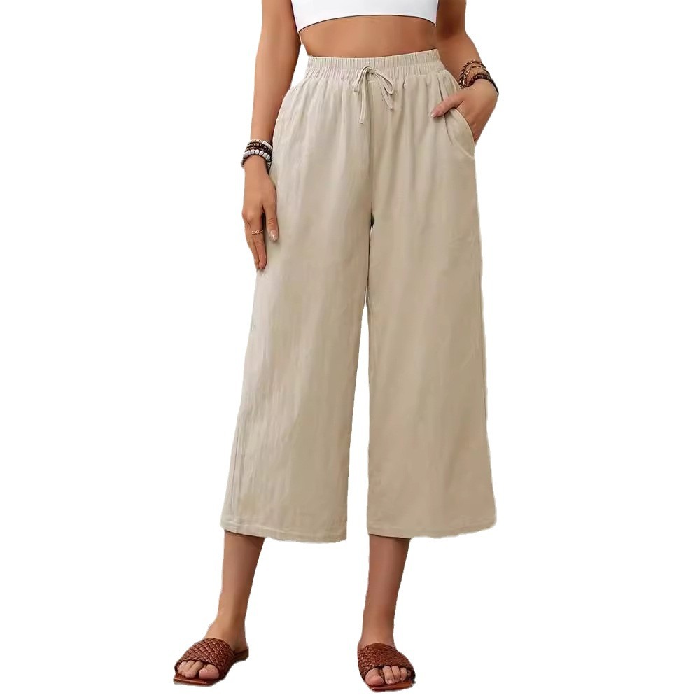 | nameOriginal | 2024 new elegant cotton and linen elastic waist pocket wide leg cropped pants commuter solid color straight casual pants women's pants |