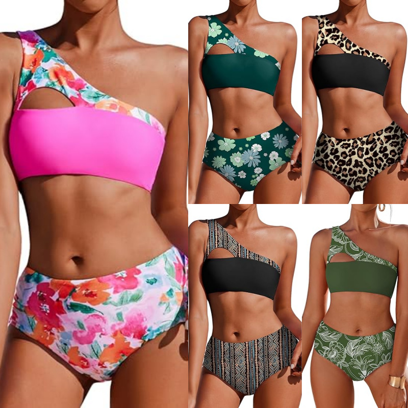 2024 New European and American Cross-border Multicolor Color Bikini Single Shoulder Strap Backless Sexy Split Swimsuit Women